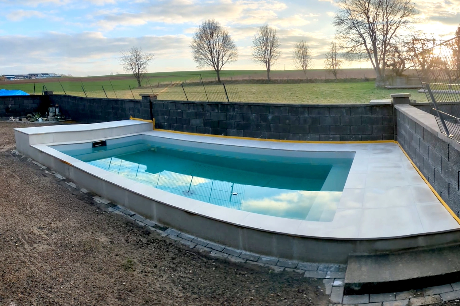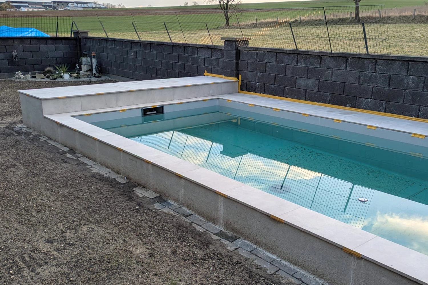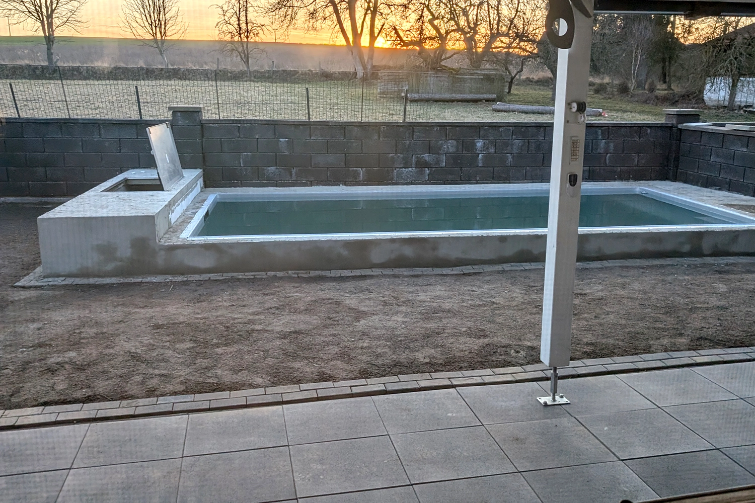 Piscine en polystyrène avec escalier et plage de la famille E., Ergoldsbach