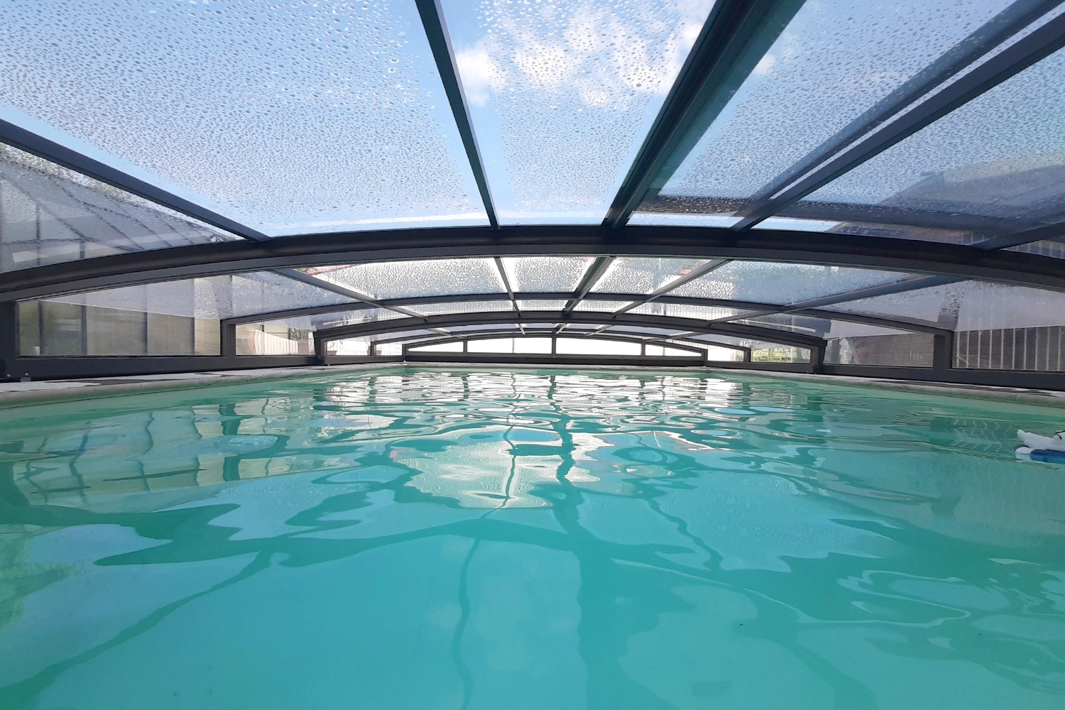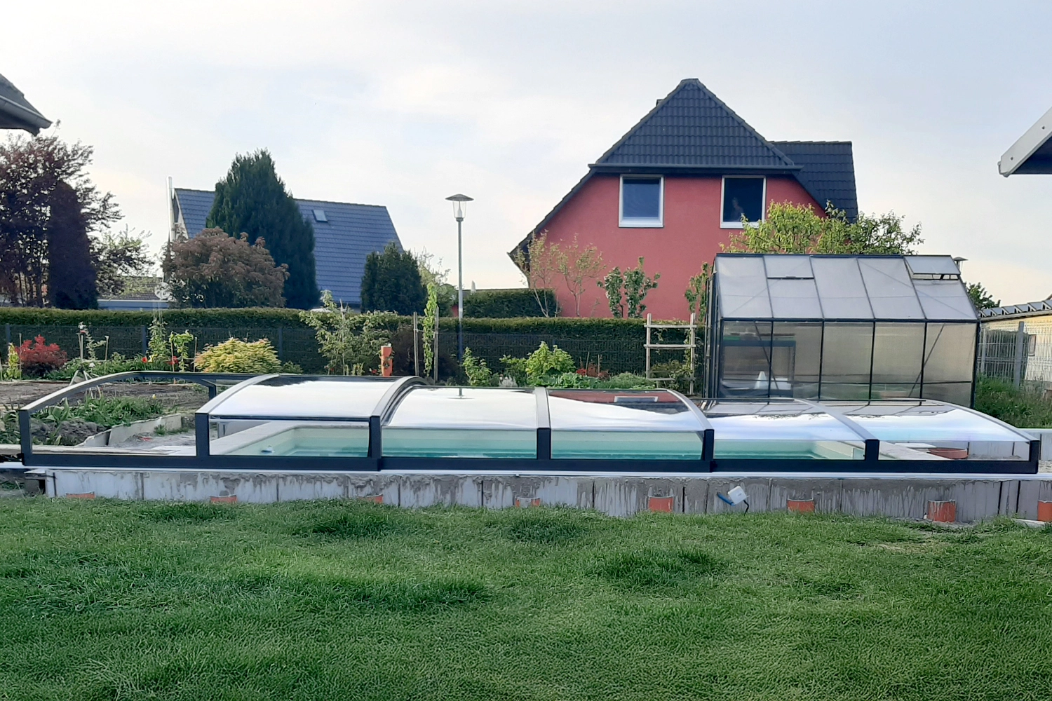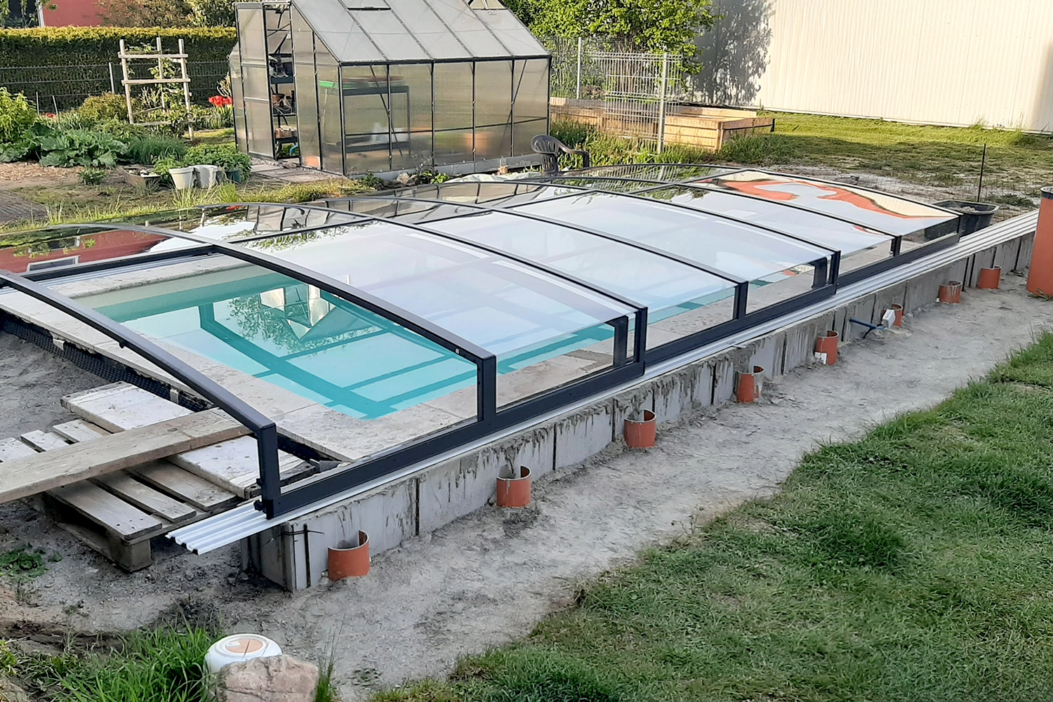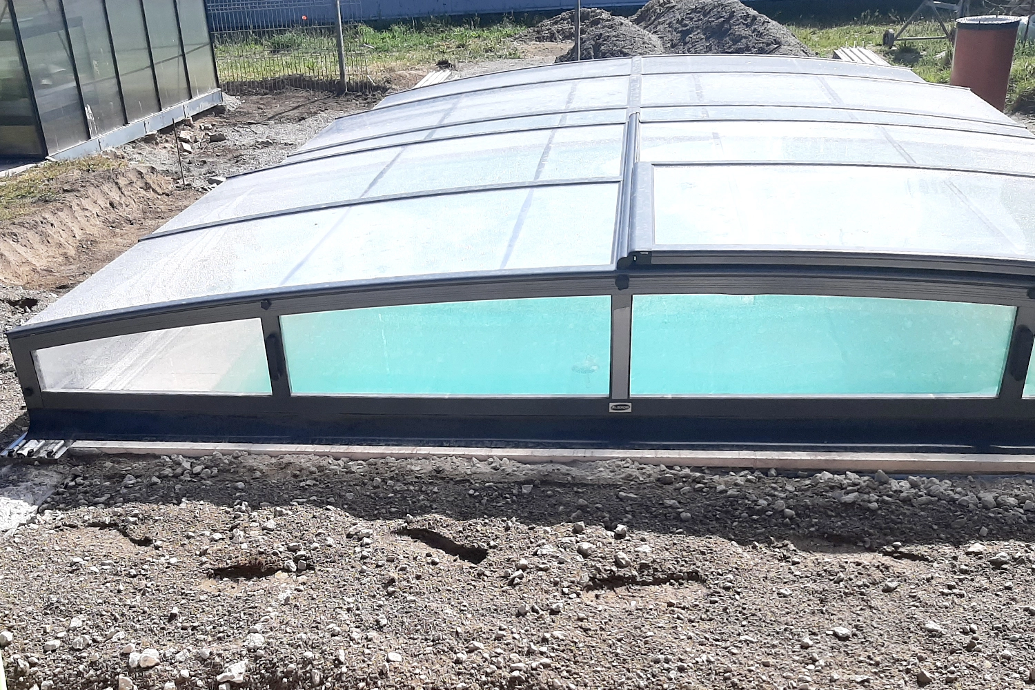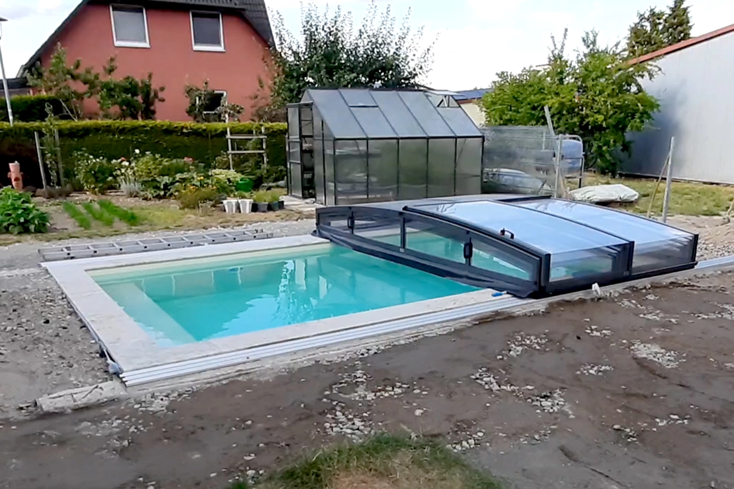 Nous sommes très satisfaits de notre décision d’avoir choisi exactement cet abri de piscine. Même si elle est très basse, avec seulement 55 cm de hauteur, on peut très bien nager dessous lorsque le toit est fermé. Il y a beaucoup d'espace pour la tête. La manipulation est également très simple. Grâce à la porte, il est très pratique d’entrer dans la piscine même lorsque le toit est fermé.