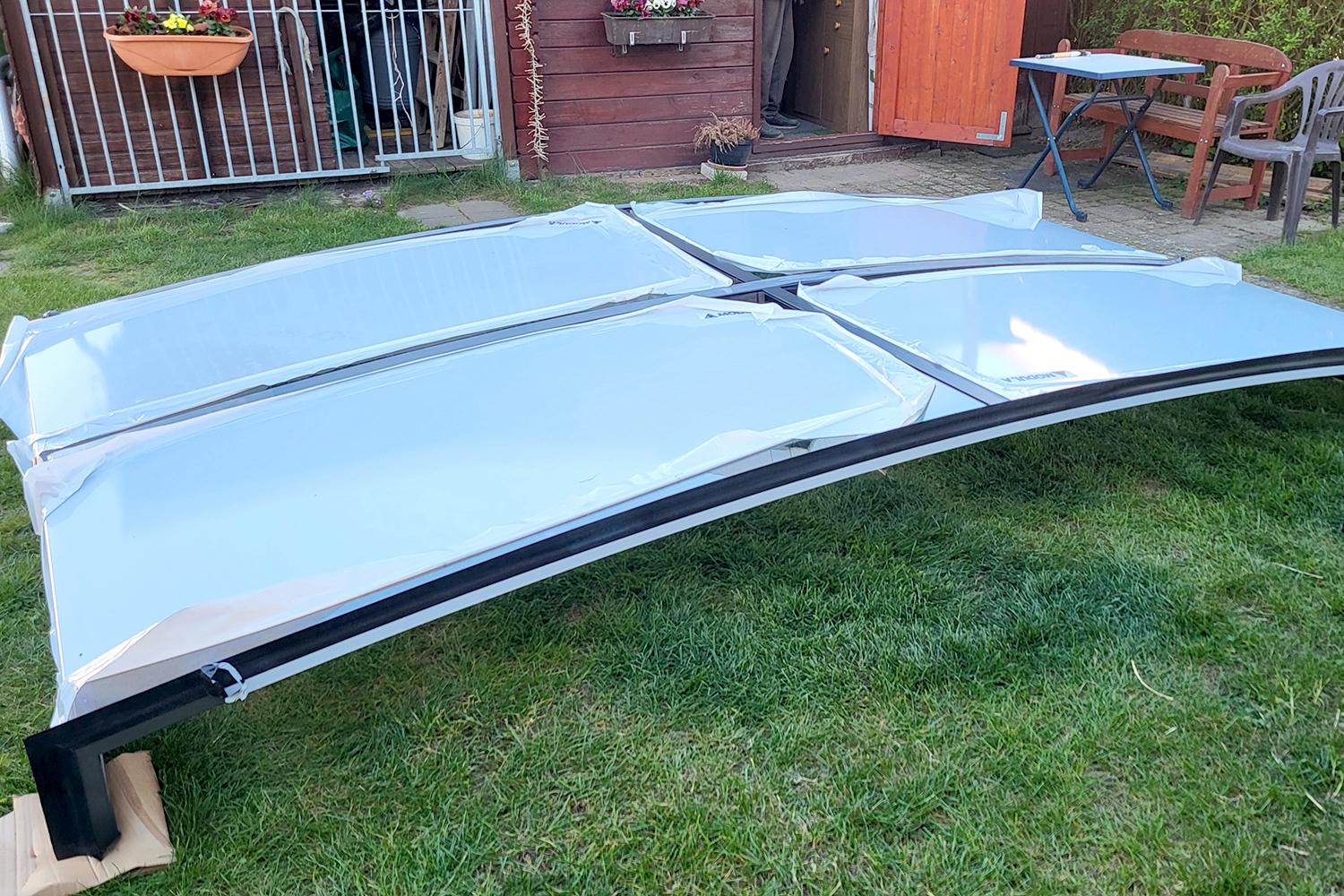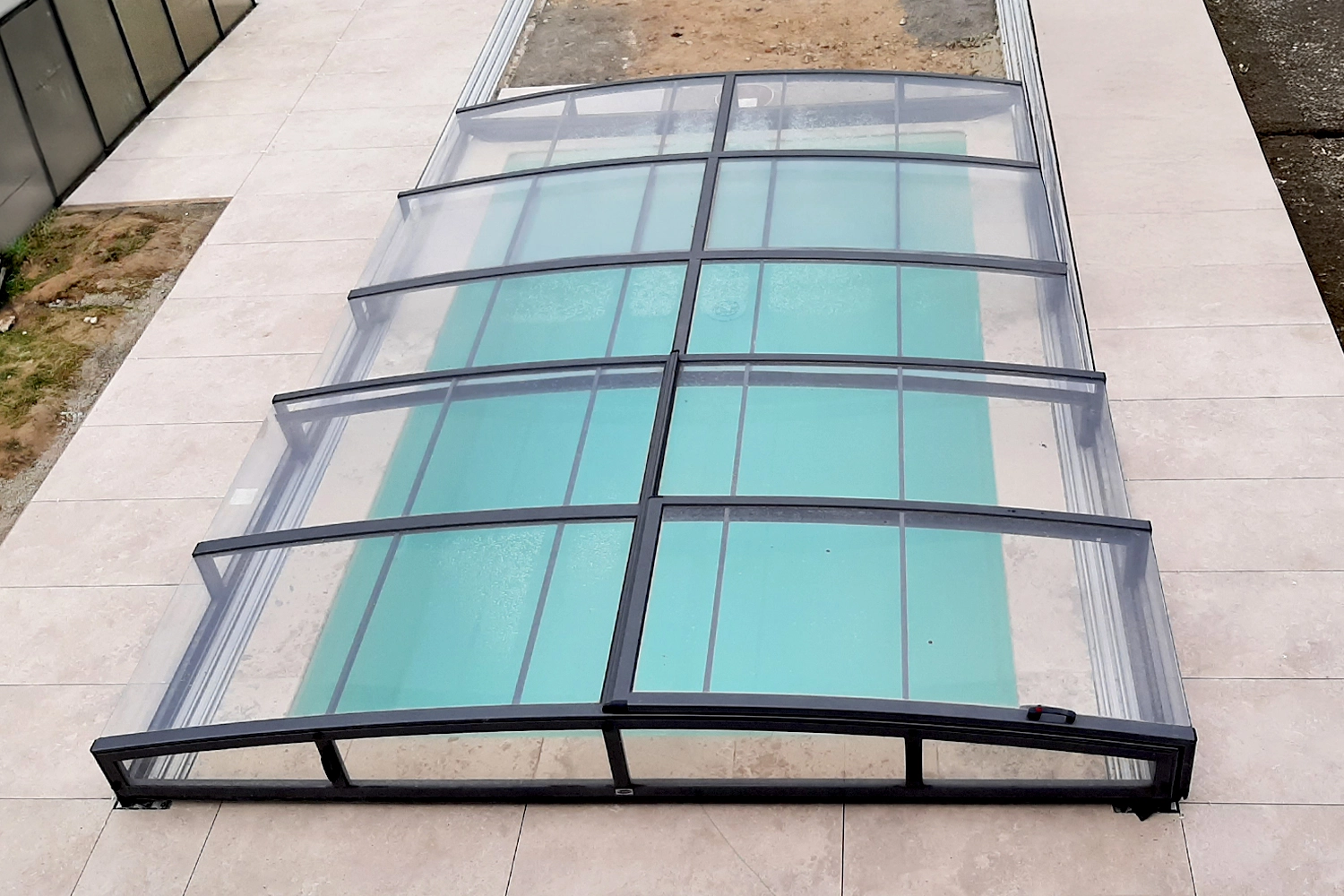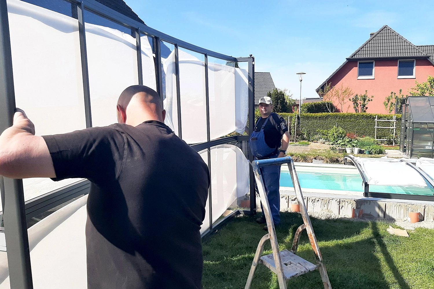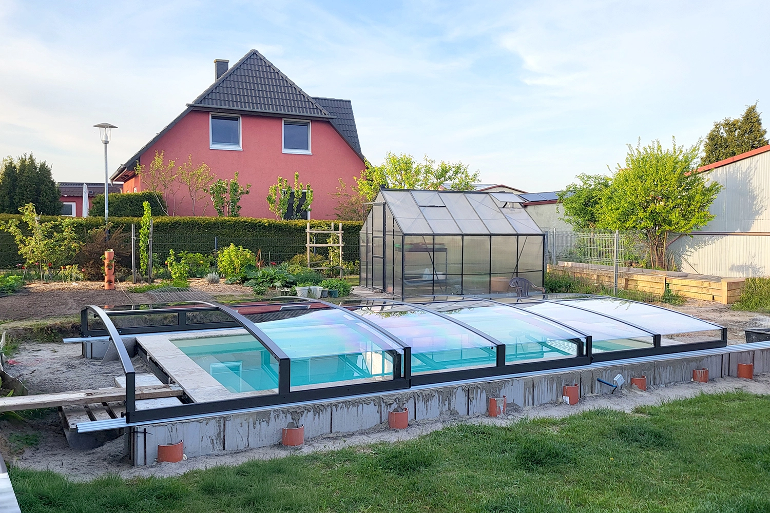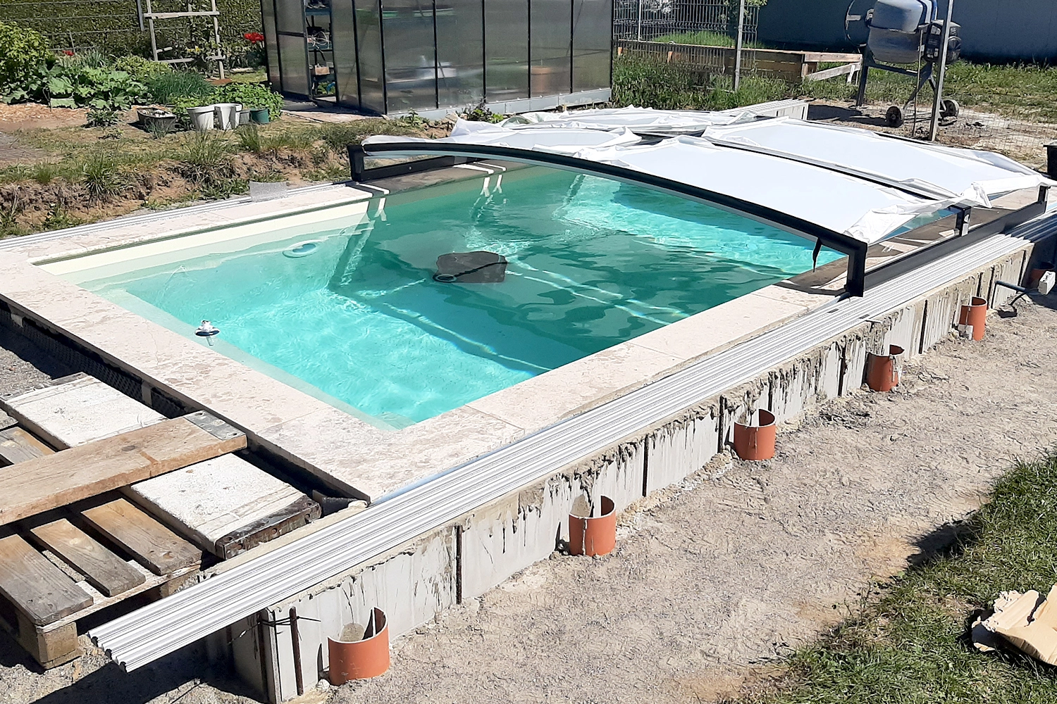Nous sommes très satisfaits de notre décision d’avoir choisi exactement cet abri de piscine. Même si elle est très basse, avec seulement 55 cm de hauteur, on peut très bien nager dessous lorsque le toit est fermé. Il y a beaucoup d'espace pour la tête. La manipulation est également très simple. Grâce à la porte, il est très pratique d’entrer dans la piscine même lorsque le toit est fermé.