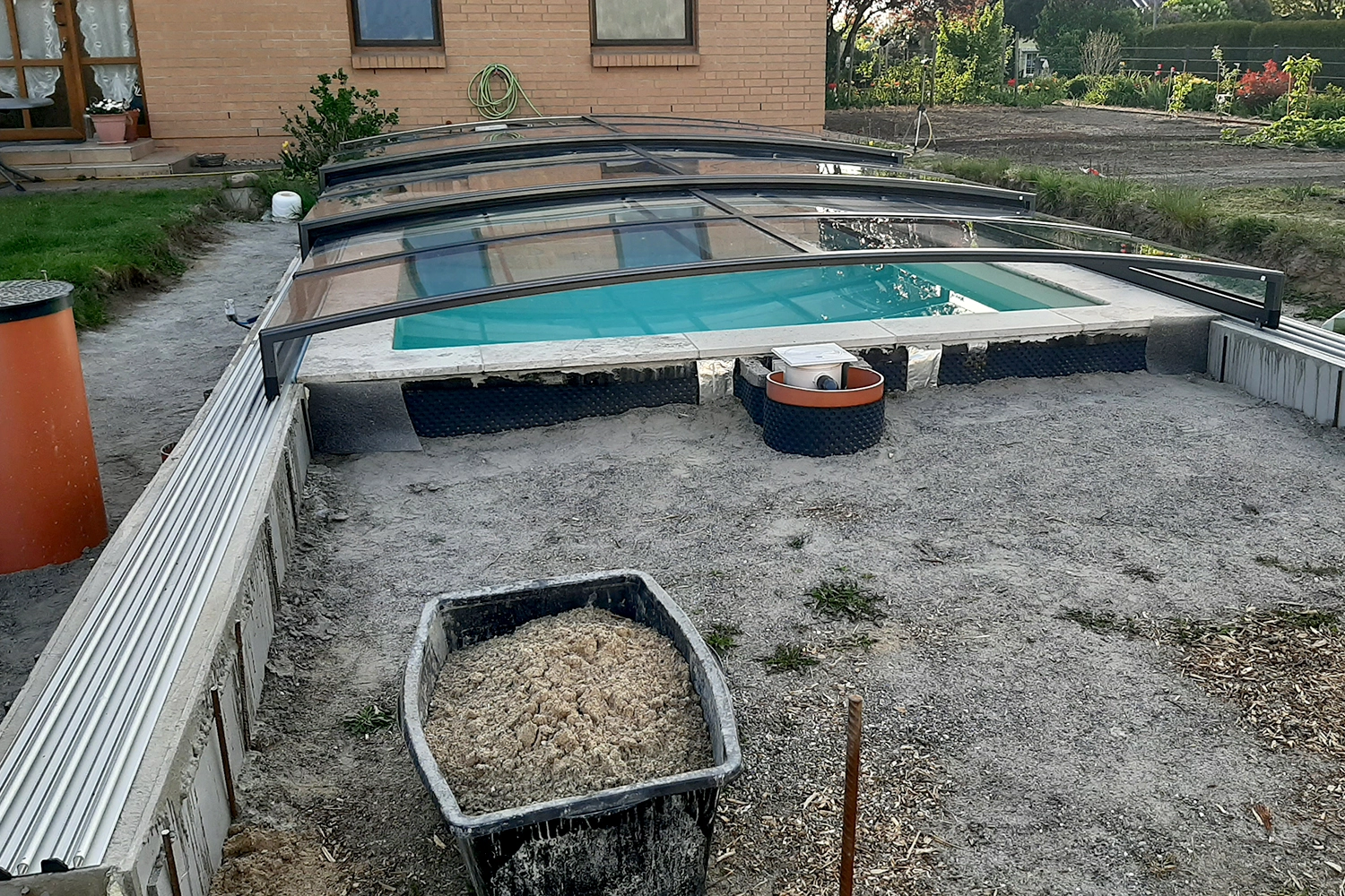 Une couverture faisait partie de nos réflexions dès le début lors de la planification de la piscine. Après tout, nous ne voulons pas de mauvaises surprises, comme que quelqu’un se retrouve accidentellement dans la piscine. On évite aussi les salissures inutiles. Et la température de l’eau se maintient plus longtemps.