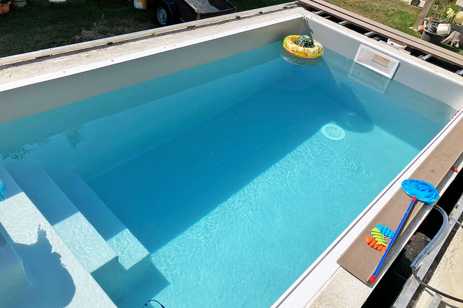 J’avais promis à mes enfants que la piscine serait prête au début des vacances d’été, le 29 juillet 2022, et l’eau remplie. Exactement ce jour-là, le premier saut a pu se faire.