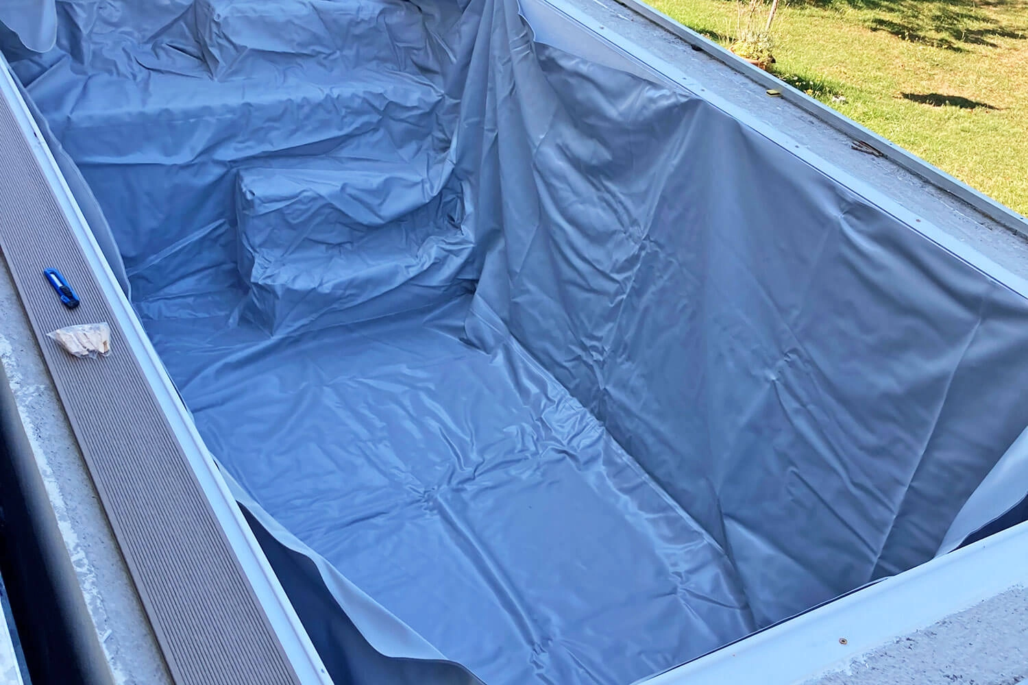 La construction de la piscine ainsi que l’installation des éléments intégrés s’est mieux passée que prévu. Nous avions le plus de respect pour la pose du liner, pensant que c’était la partie la plus délicate. Mais cela s’est avéré beaucoup plus simple et moins compliqué que prévu. Le liner s’installe parfaitement dans le profil et sans aucun pli. Cela nécessite évidemment de la précision dans les travaux préparatoires, comme le lissage et la pose de la feutrine. L’ajustement est donc parfait.