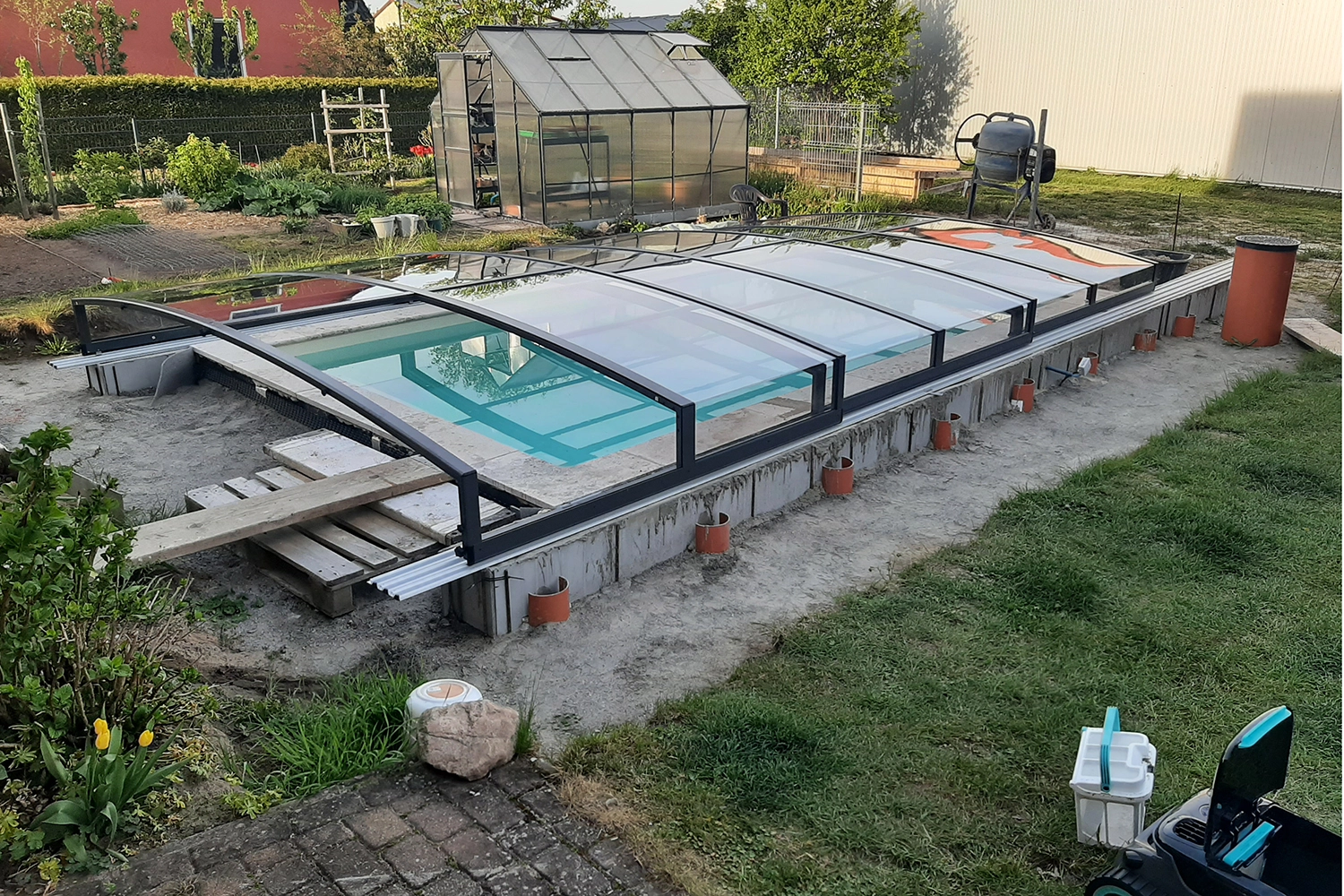 Après déduction du kit piscine Apoolco et de l'abri de piscine nous a coûté environ 28 400 €. Les coûts se répartissent ainsi : 2 500 € pour les bordures, 9 000 € pour le carrelage, le mortier de drainage, la colle et le joint d’étanchéité, 2 000 € pour les armatures en béton, les paniers d’armature, la couche bitumeuse et la membrane à plots, 1 500 € pour le béton de la dalle, 600 € pour la masse de ragréage, 1 500 € pour le ciment des blocs en polystyrène et des fondations, 800 € pour les barres d’armature, 1 000 € pour les tuyaux KG, 3 000 € pour l’évacuation et l’excavation, 2 500 € pour la location de matériel de chantier, et enfin 4 000 € pour le gravier, le sable, les matériaux RC et divers petits matériaux.