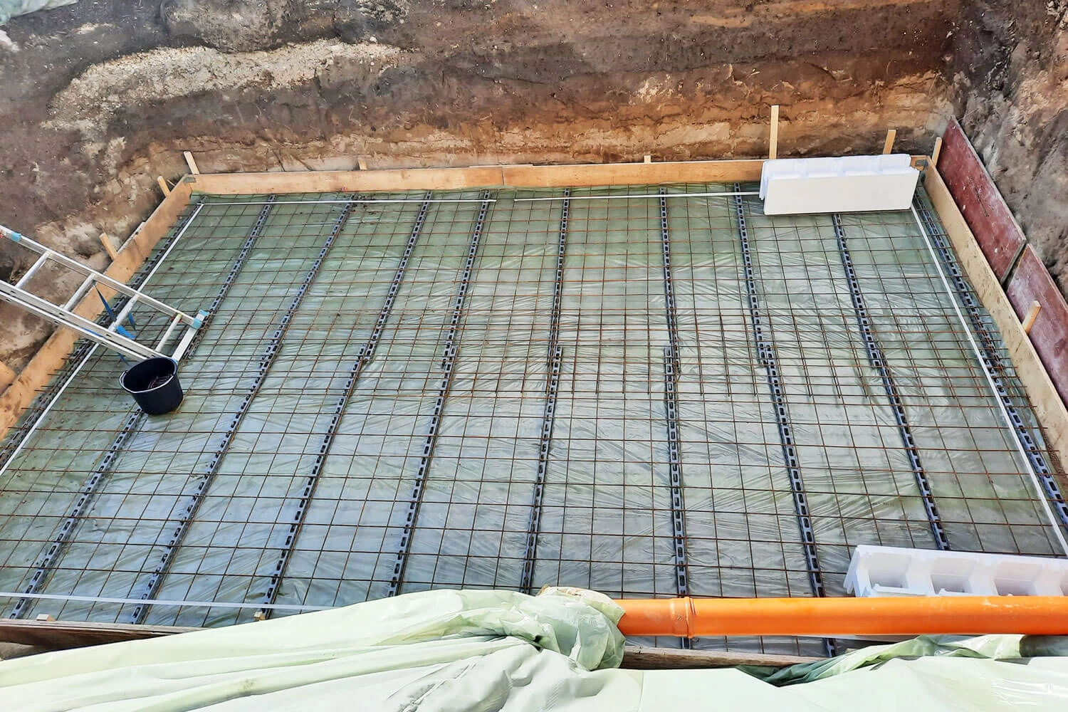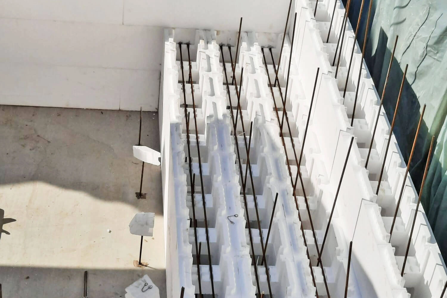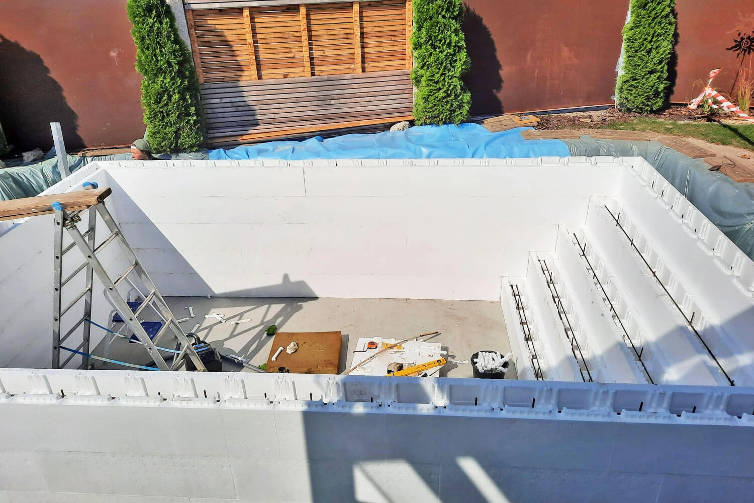 Les travaux de bétonnage et le remplissage des murs en polystyrène ont été plus stressants que prévu. Nous avions lu beaucoup d’expériences négatives sur ce point. C’est pourquoi nous avons fait appel à une entreprise de transport de béton expérimentée dans la construction de piscines. Le remplissage lent avec une pompe à chape électrique, un tuyau long et des aides solides a très bien fonctionné.