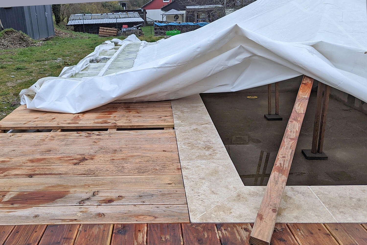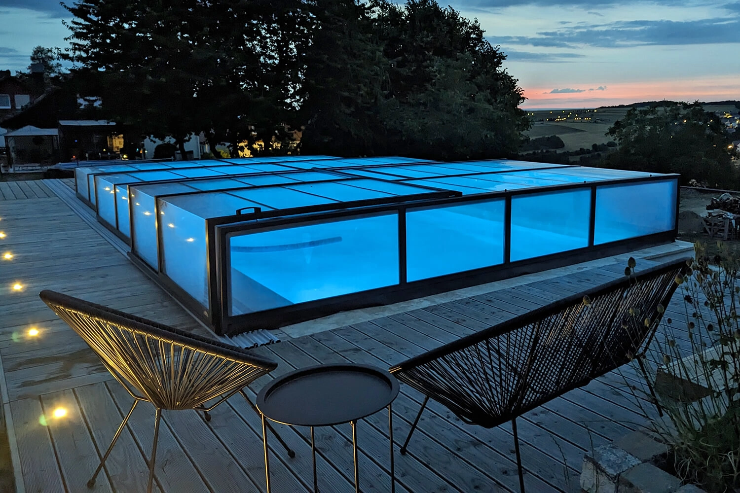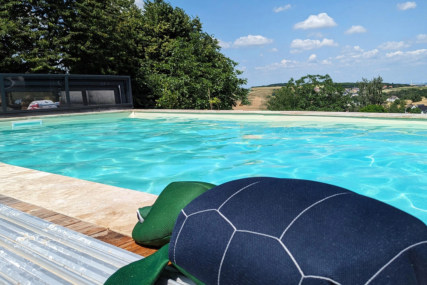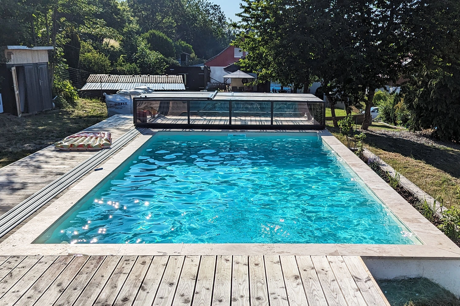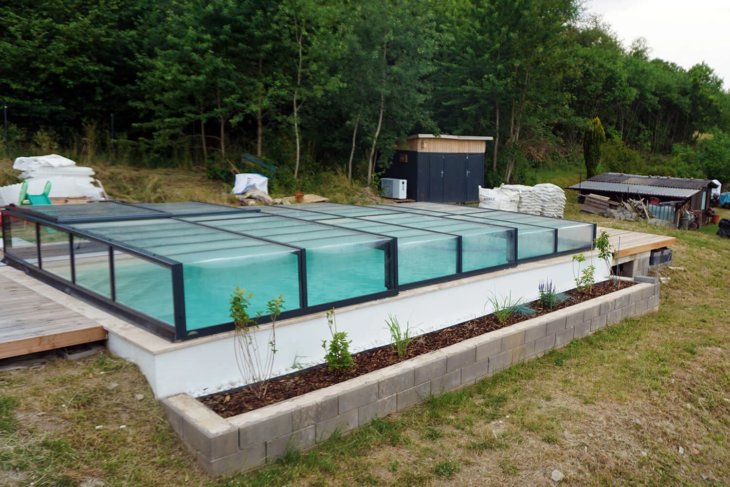 Projecteurs, électrolyseur au sel avec régulation du pH et pompe à chaleur étaient prévus dès le départ. Malheureusement, Apoolco n’avait pas de couverture adaptée pour nous.