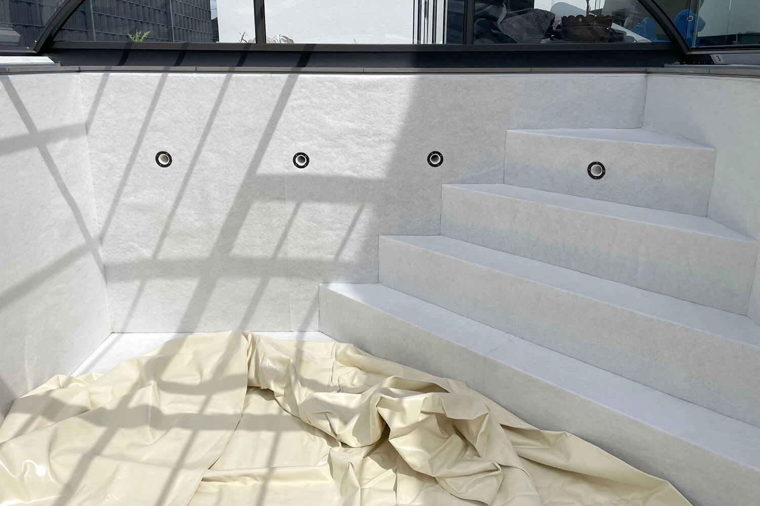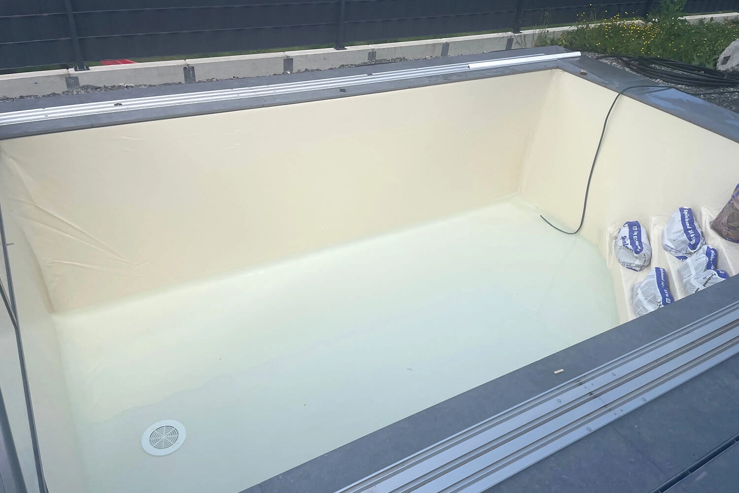 La pose du liner a été plus simple que prévu (remarque : il faut qu’il fasse assez chaud et que le soleil brille sur le liner ; il devient alors très souple et facile à tendre).
