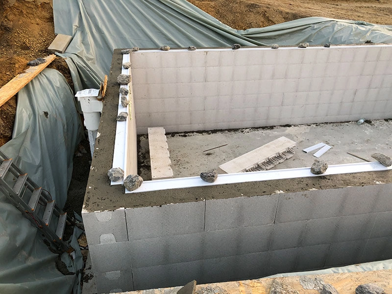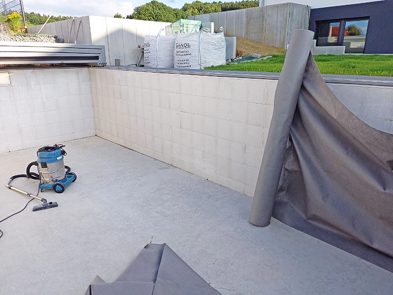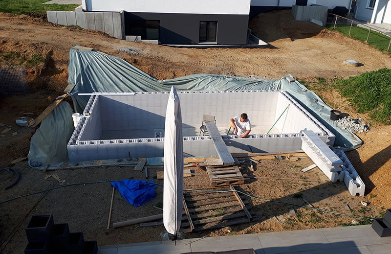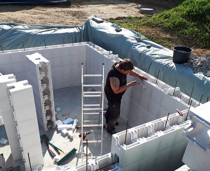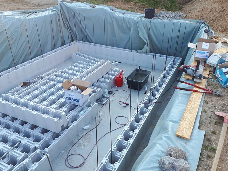 L’assemblage des blocs en polystyrène a été très simple, ils s’emboîtaient parfaitement. Nous avons doublé l’armature en fer recommandée pour les murs, ce qui les a rendus très solides et nous a évité tout risque d’écartement lors du bétonnage. La pose de la bâche a également été plus facile que prévu.