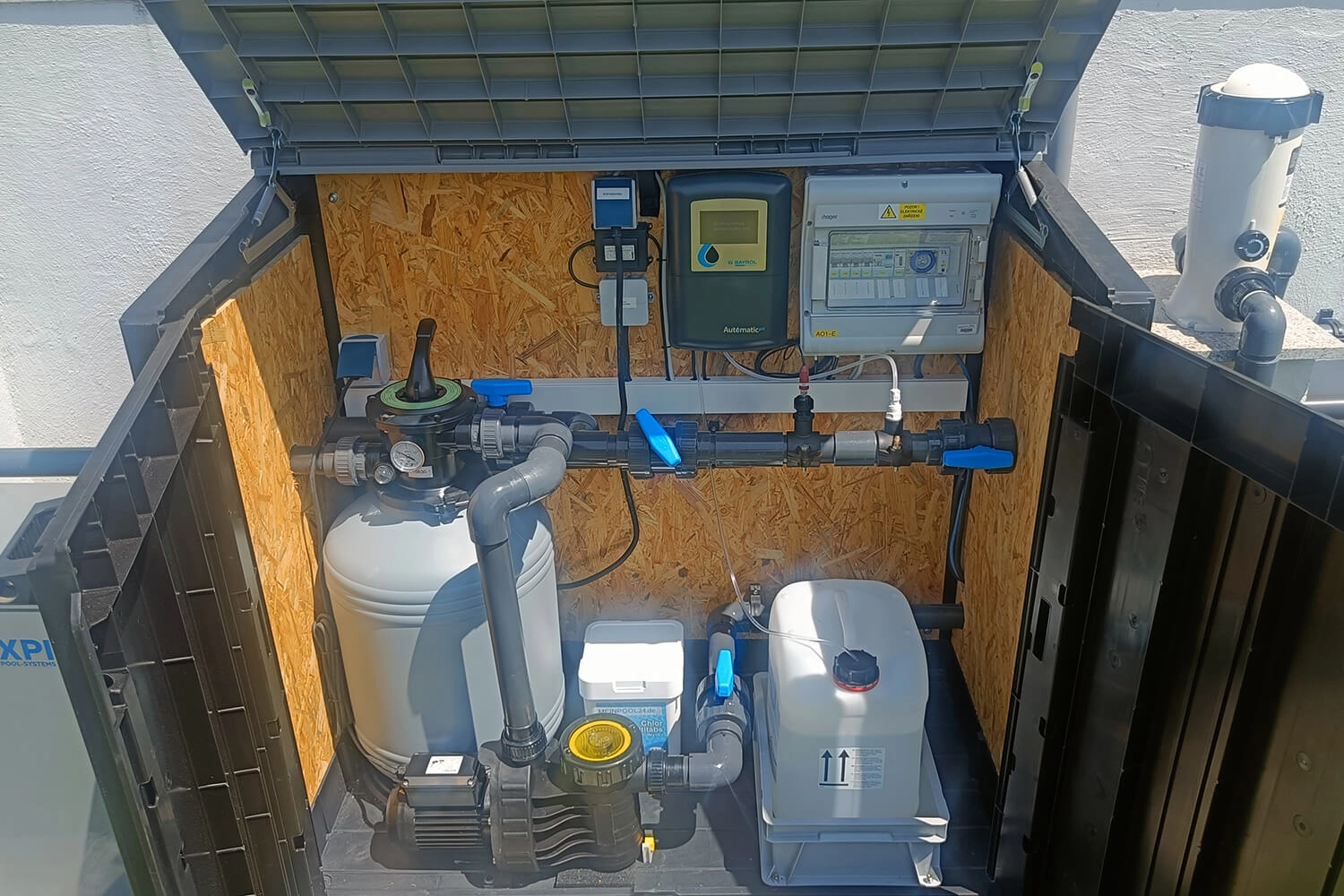 Projecteurs, doseur du pH, pompe à chaleur et un doseur du chlore.