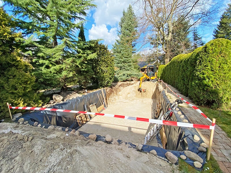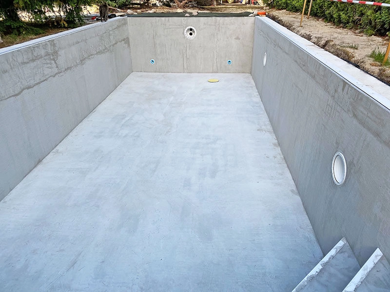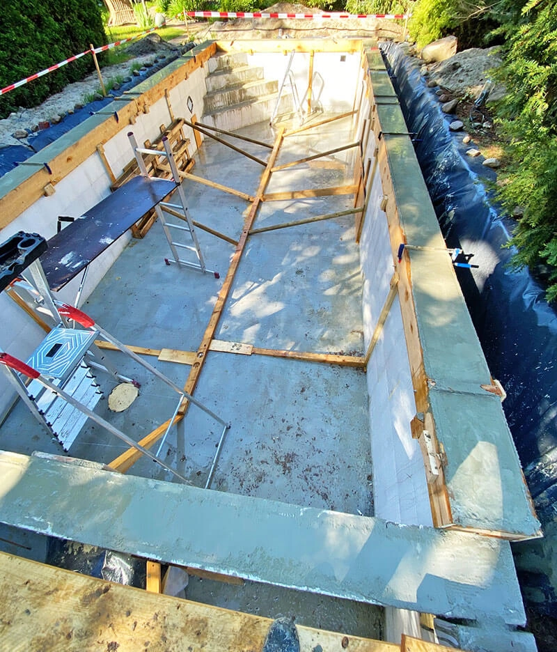 Nous avons construit une piscine High-Level avec débordement sur un côté, et non une piscine classique à skimmer, ce qui a considérablement augmenté la complexité. Par exemple, la bordure de la rigole devait être réalisée avec une précision de +/- 2 mm. La construction du puits technique, l’installation de la tuyauterie (dérivations pour panneaux solaires, pompe à chaleur, électrolyseur et électricité) ont demandé beaucoup plus de temps que prévu. Le contour de la piscine a également été un travail minutieux, car il fallait créer des fondations solides pour les dalles de terrazzo là où se trouvait auparavant la tranchée.