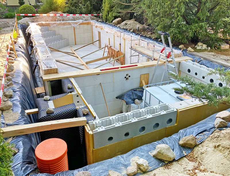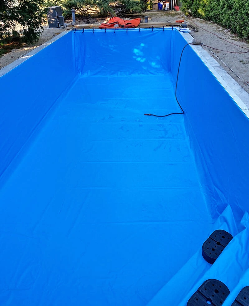 Nous n’avions aucune expérience en construction de piscine. L’excavation a été rapide : notre sol sableux ressemblait à un grand bac à sable ! L’assemblage des blocs en polystyrène s’est déroulé assez vite, malgré quelques ajustements nécessaires à cause de variations de dimensions des blocs. La pose du liner s’est également révélée plus simple que prévu et à deux personnes, c’est un jeu d’enfant. Nous avons été agréablement surpris de voir à quel point le liner s’adaptait parfaitement à la forme de la piscine, surtout autour de l’escalier d’angle. Chapeau aux fabricants du liner ! La mise sous vide a seulement été nécessaire pour l’escalier et s’avère surtout utile si l’on remplit la piscine très rapidement, ce qui n’était pas notre cas (il nous a fallu presque deux jours pour remplir entièrement la piscine).