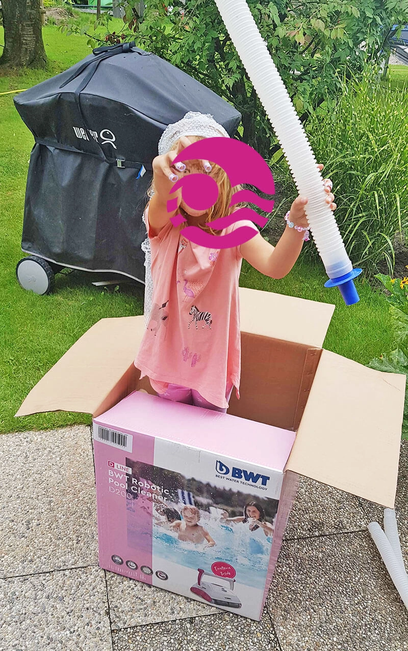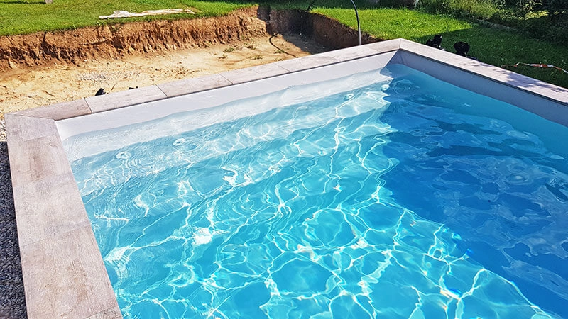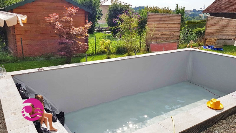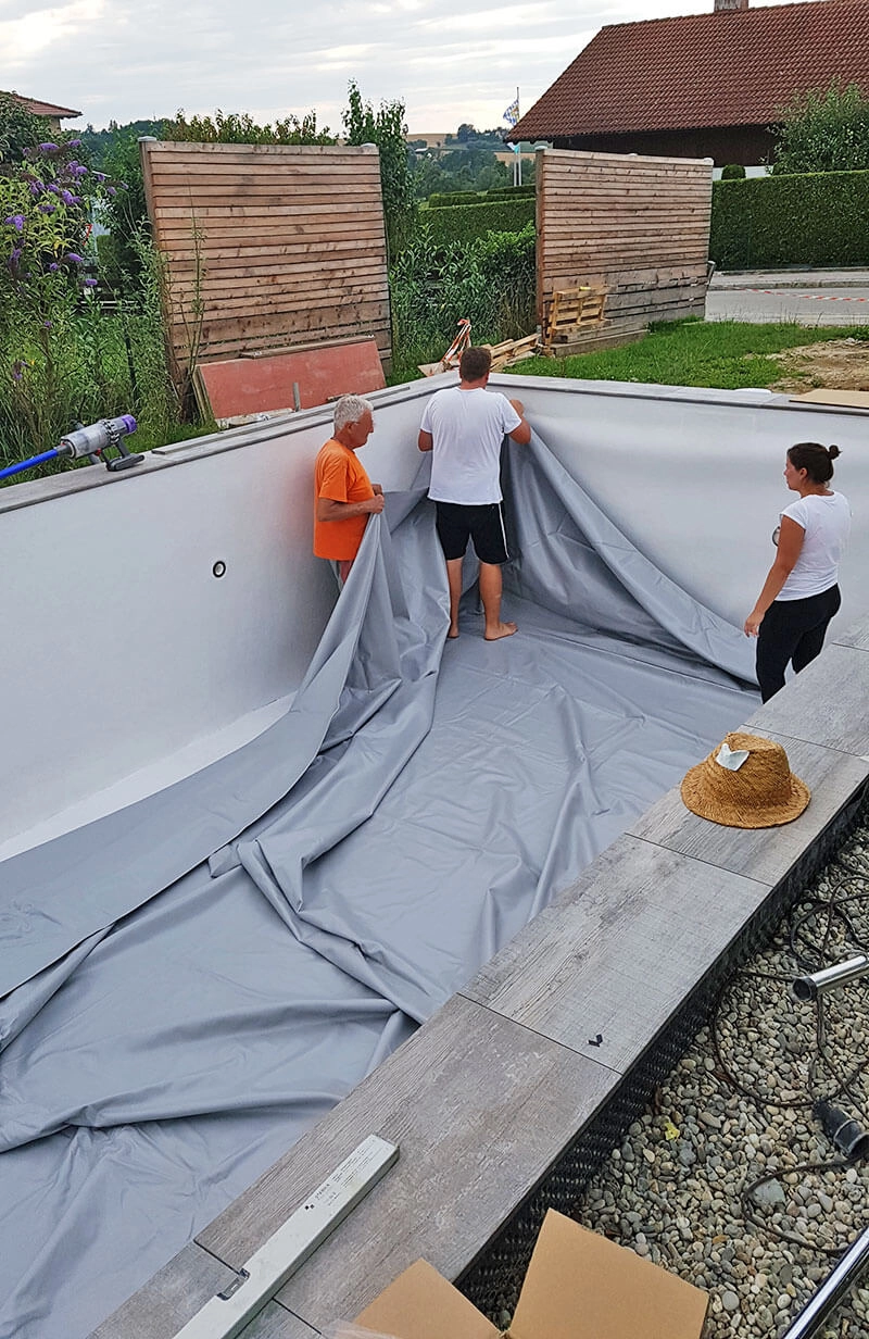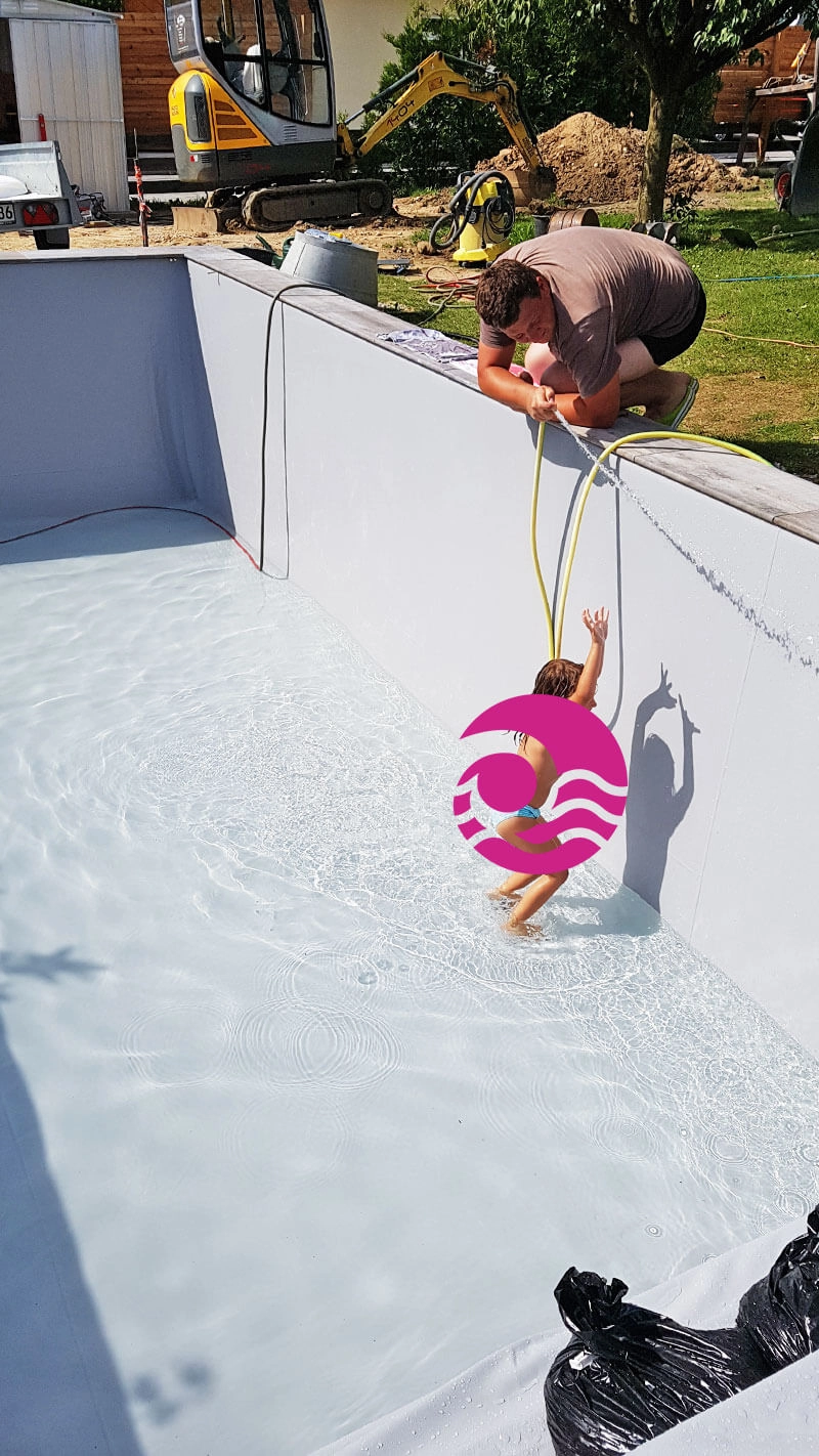 La pose du liner a été beaucoup plus facile que nous l’avions imaginé. Il suffit de prendre son temps, d’ajouter un peu d’eau pour lisser les plis et de faire attention à l’escalier. Totalement facile.