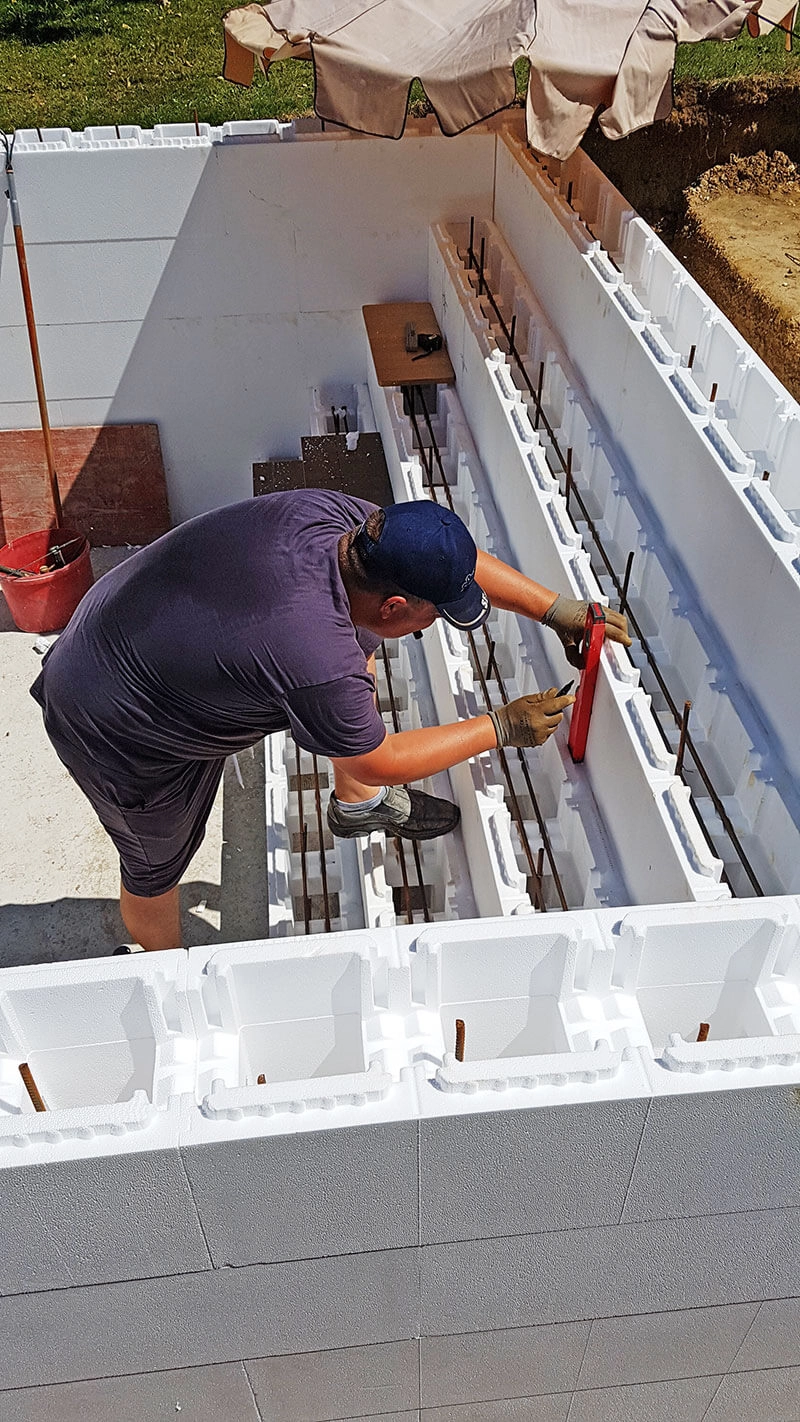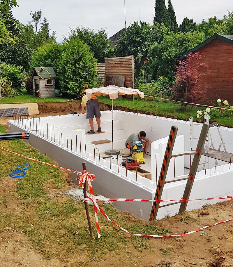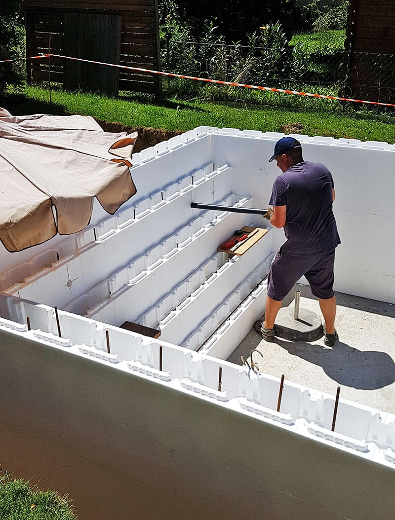 Notre rêve de piscine a commencé avec l’idée de faire appel à une entreprise pour construire un bassin. Après avoir vu les coûts, nous avons abandonné — beaucoup trop cher. Par hasard, nous avons découvert Apoolco et avons eu un bon pressentiment dès le début. Les conseils téléphoniques amicaux et la grande sélection sur le site nous ont donné confiance. Surtout, les explications sur YouTube et les instructions détaillées nous ont apporté toute la sécurité nécessaire. Un ami avait construit sa piscine lui-même l’année précédente avec une entreprise et a pu beaucoup nous aider pour la pose des blocs en polystyrène, la dalle, les armatures verticales et le remplissage des murs. Il faut juste se lancer. Important : lire le manuel plusieurs fois pour ne rien oublier. Il est aussi conseillé qu’une deuxième personne le lise. Dans notre cas, ma femme m’a signalé deux erreurs, facilement corrigées. Pour le montage : creuser le trou à la bonne hauteur, prévoir le remblai et la dalle. Lors du bétonnage, poser directement les armatures à distance correcte pour éviter perçage et collage. La dalle doit être parfaitement lisse, car les irrégularités apparaissent une fois l’eau remplie. La pose des blocs a été un jeu d’enfant. Nous les avons fixés avec du mortier-colle et pressés avec les armatures vers le bas, rangée par rangée pour assurer la stabilité. Pour les éléments intégrés, marquer où seront les buses et lumières pour que les armatures ne gênent pas. Procéder avec précaution pour ne pas endommager les blocs, utiliser les blocs défectueux dans l’escalier. La tuyauterie a été simple : nettoyer, appliquer généreusement le colle et emboîter sans tourner. J’ai pointé un tuyau pour percer l’escalier. Toutes les buses ont été fixées avec des planches, vissées directement dans le polystyrène. Nous avons ensuite doublé le lissage des murs et de l’escalier. Poser les rails du liner et sceller au silicone pour éviter l’infiltration d’eau derrière le liner. Bien ajuster les coins. Poser les margelles, accrocher le liner, et installer les éléments intégrés selon le niveau d’eau. Tout est décrit dans le manuel. En résumé : si vous êtes habile, vous pouvez le faire vous-même.