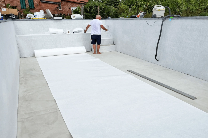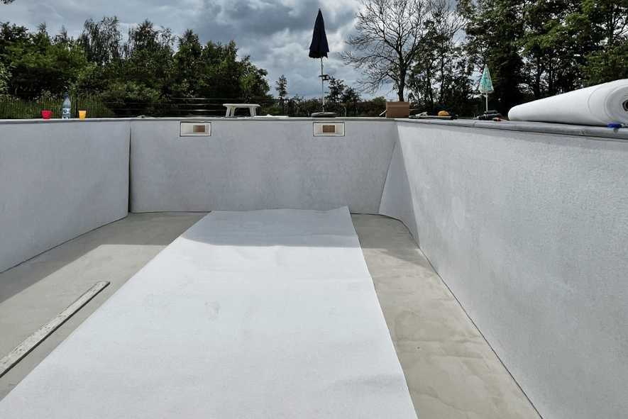 La pose du liner a été relativement simple… mais former un angle à 90° à partir du profil plat du liner est délicat, donc les coins étaient un peu compliqués à installer. Pour le liner au niveau de l’escalier, nous n’avons pas réussi à éviter les plis sur les arêtes verticales des marches, mais tout le reste est parfait. Un marquage à l’intérieur du liner a ajouté un peu de confusion : 700 × 400 × 150. Comme notre piscine fait 8 mètres de long, nous avons eu peur car le liner semblait très tendu. Heureusement, nous nous en sommes rendu compte seulement après avoir déjà installé la majeure partie du liner. Probablement une erreur de marquage… encore une chance !