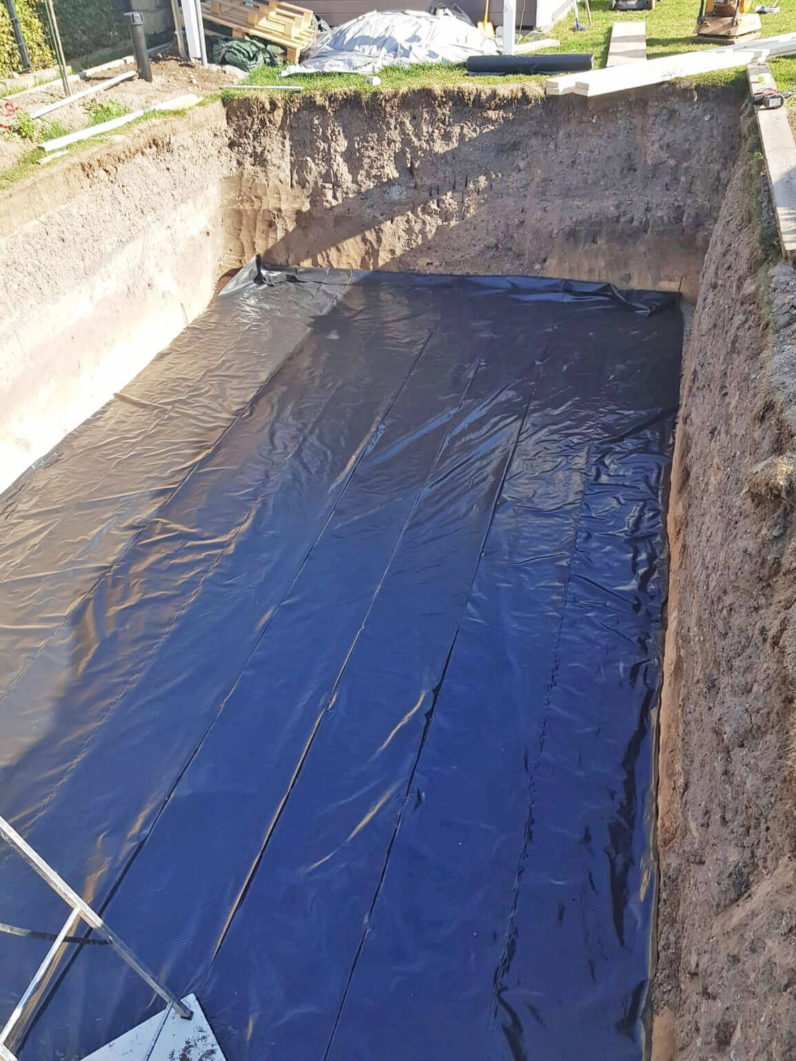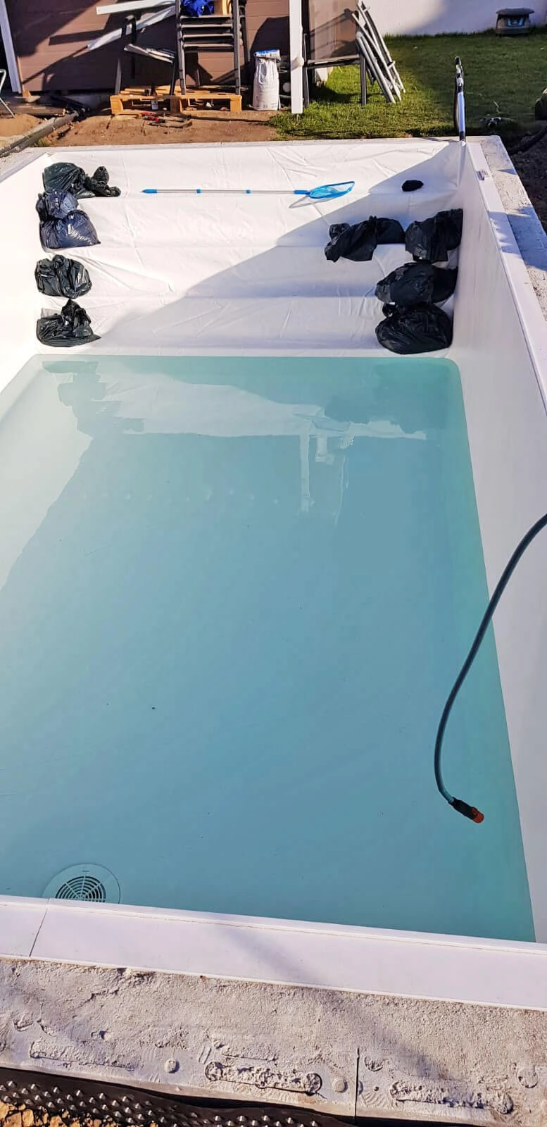 Nous nous demandions comment poser le liner sans plis, ce qui nous inquiétait un peu. Avec un vieux aspirateur pour aspirer l’air entre le liner et la paroi, l’opération s’est révélée très facile et rapide.