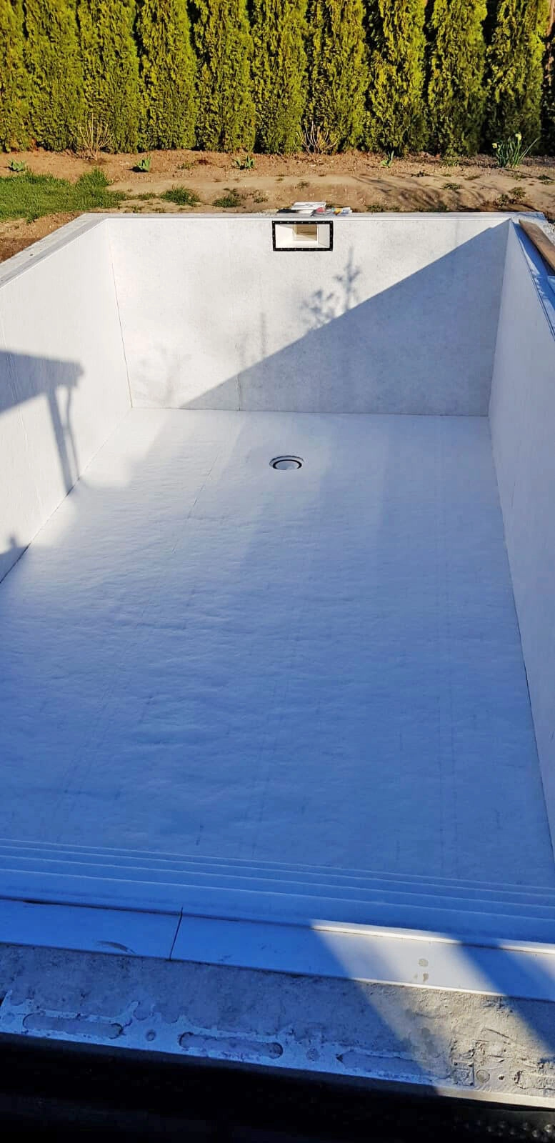Fixer les éléments supplémentaires a été un peu plus compliqué, car le liner rendait difficile la localisation des trous pour les vis, notamment pour le drain de fond. Pour le projecteur et les buses de refoulement, nous avons pu déterminer leur emplacement grâce à des photos prises à l’avance, ce qui a beaucoup aidé. Installer le liner dans les angles sans qu’il se déplace a nécessité plusieurs tentatives. Dans ce cas, des profilés de serrage seraient probablement plus pratiques.
