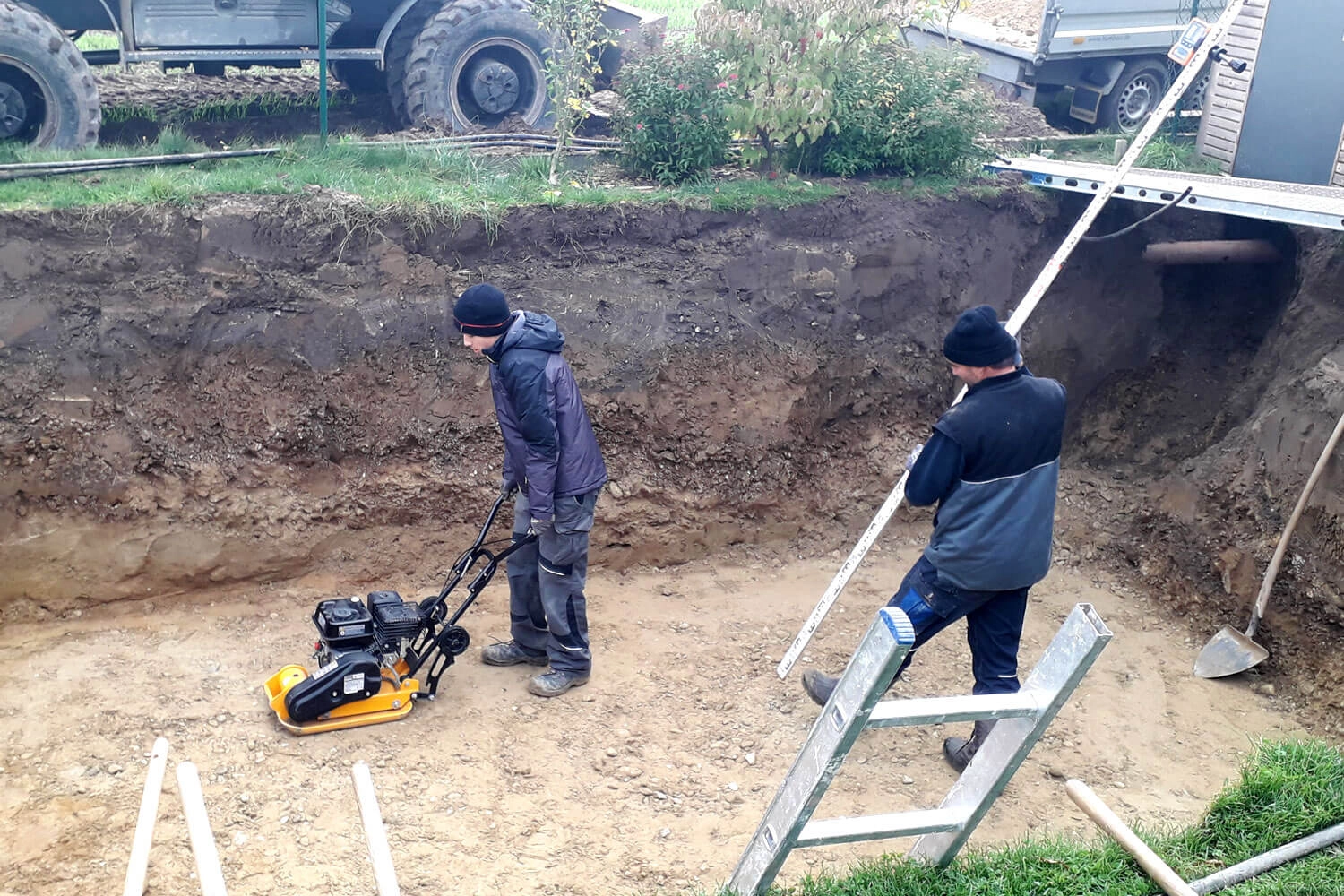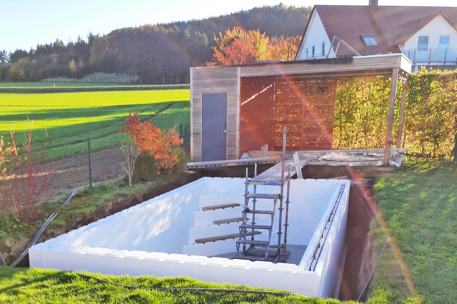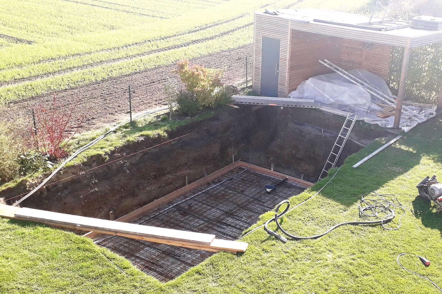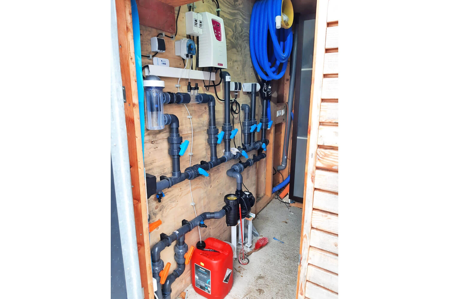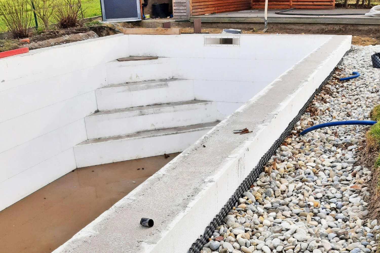 La pose du liner sans plis dans le bassin ni sur l’escalier. Avant l’installation des conduites pour la technique de la piscine, nous étions également un peu inquiets, mais les instructions fournies sont vraiment excellentes et très détaillées.