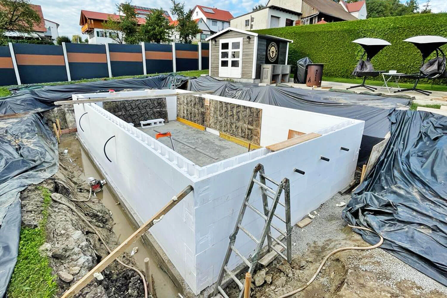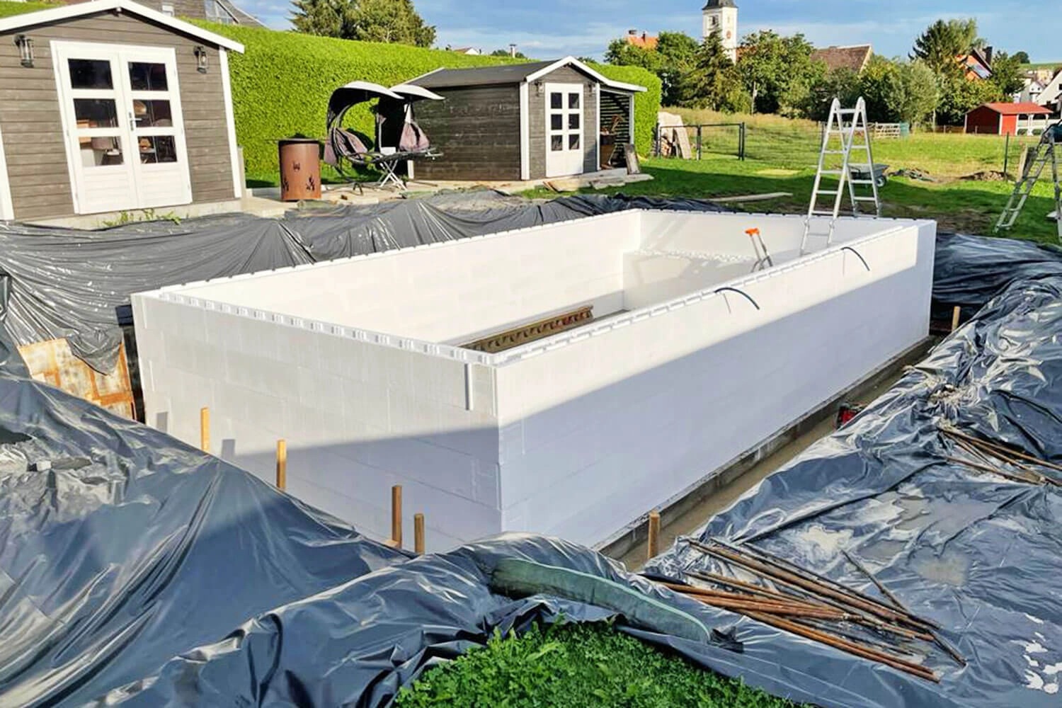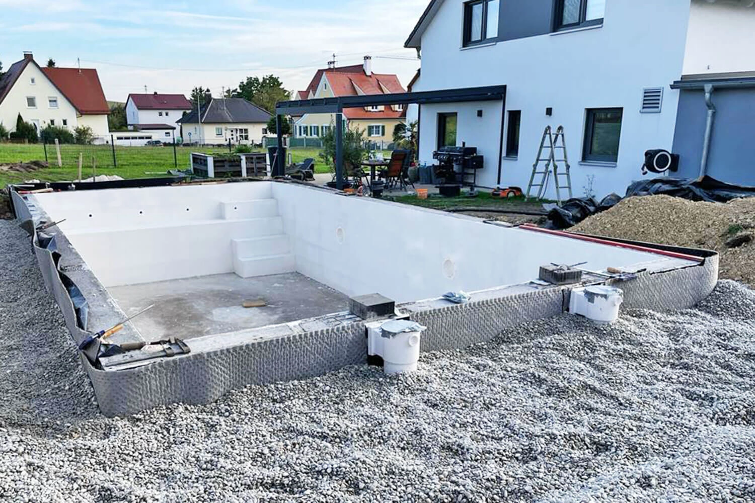 Piscine en polystyrène avec escalier et plage de la famille M., Röfingen
