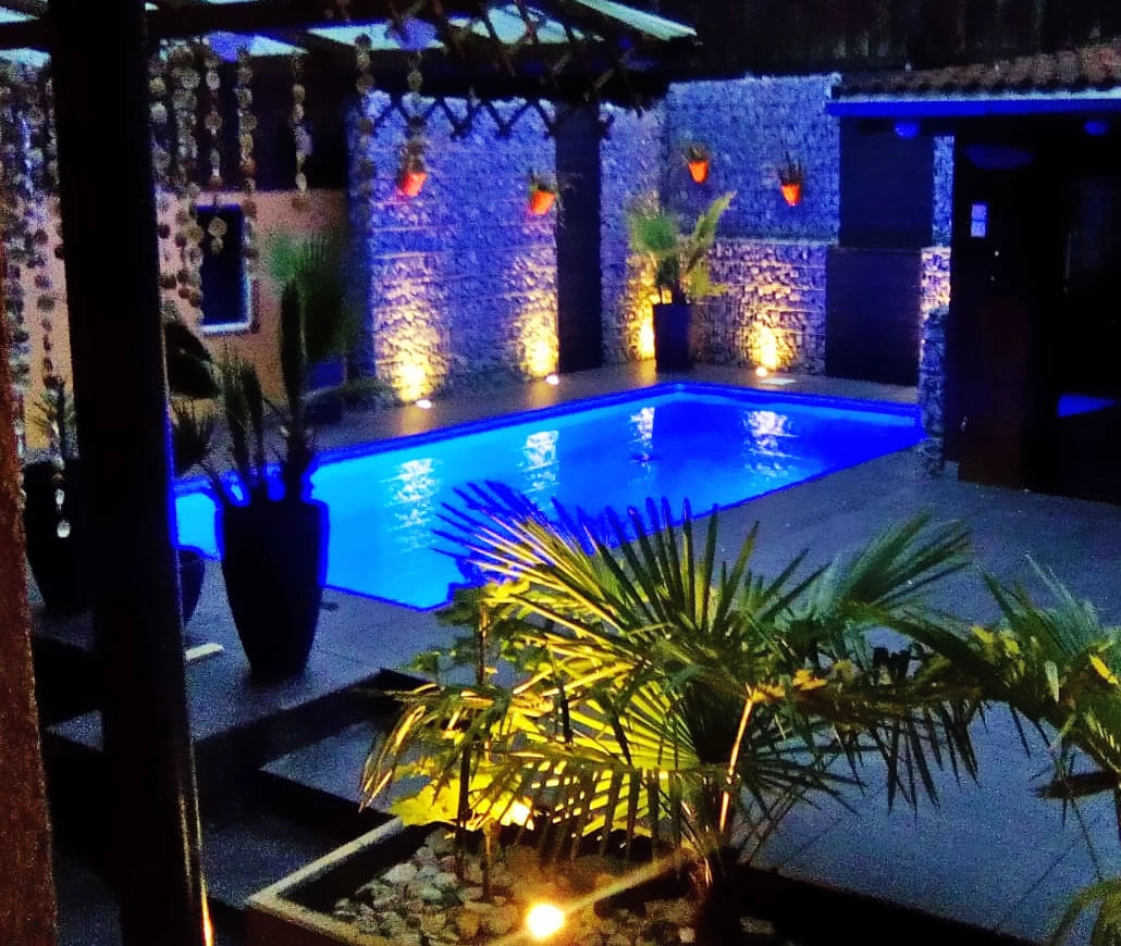 Électrolyseur au sel, 2 projecteurs avec ampoules LED bleues, nage à contre-courant ; la technique de la piscine est installée dans le local technique annexe.