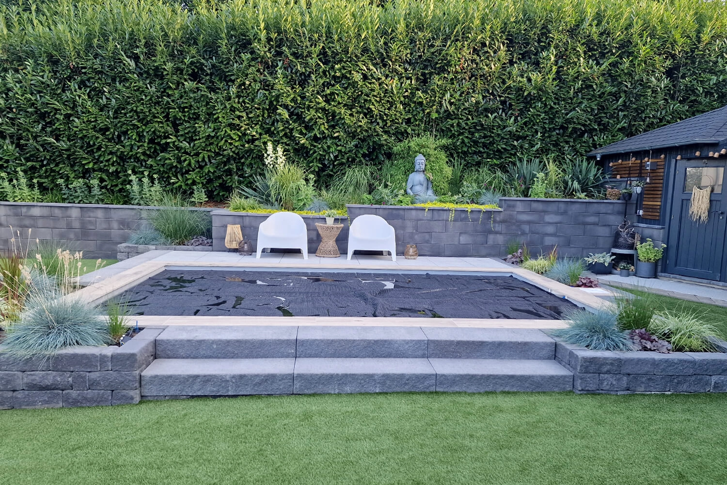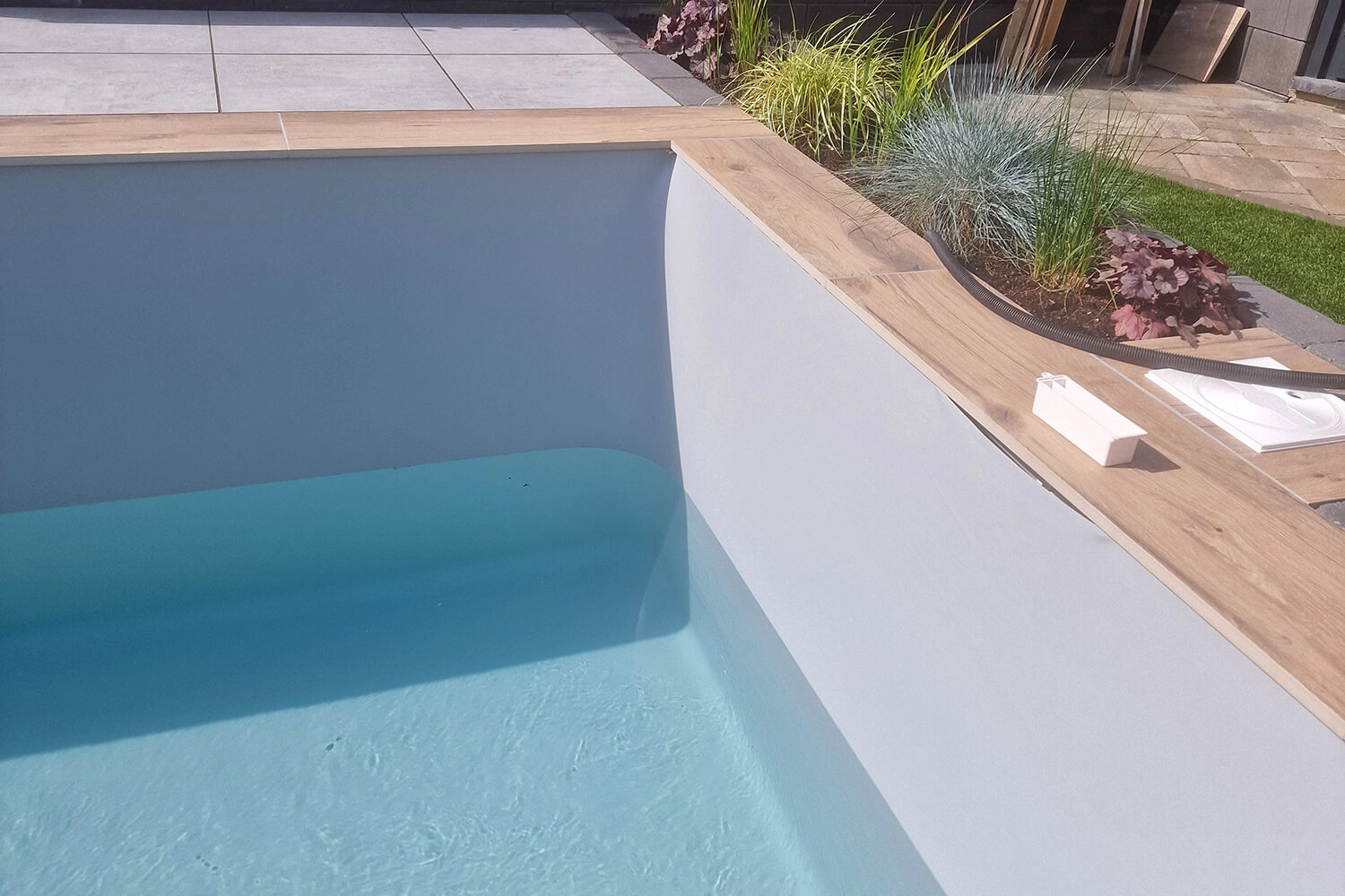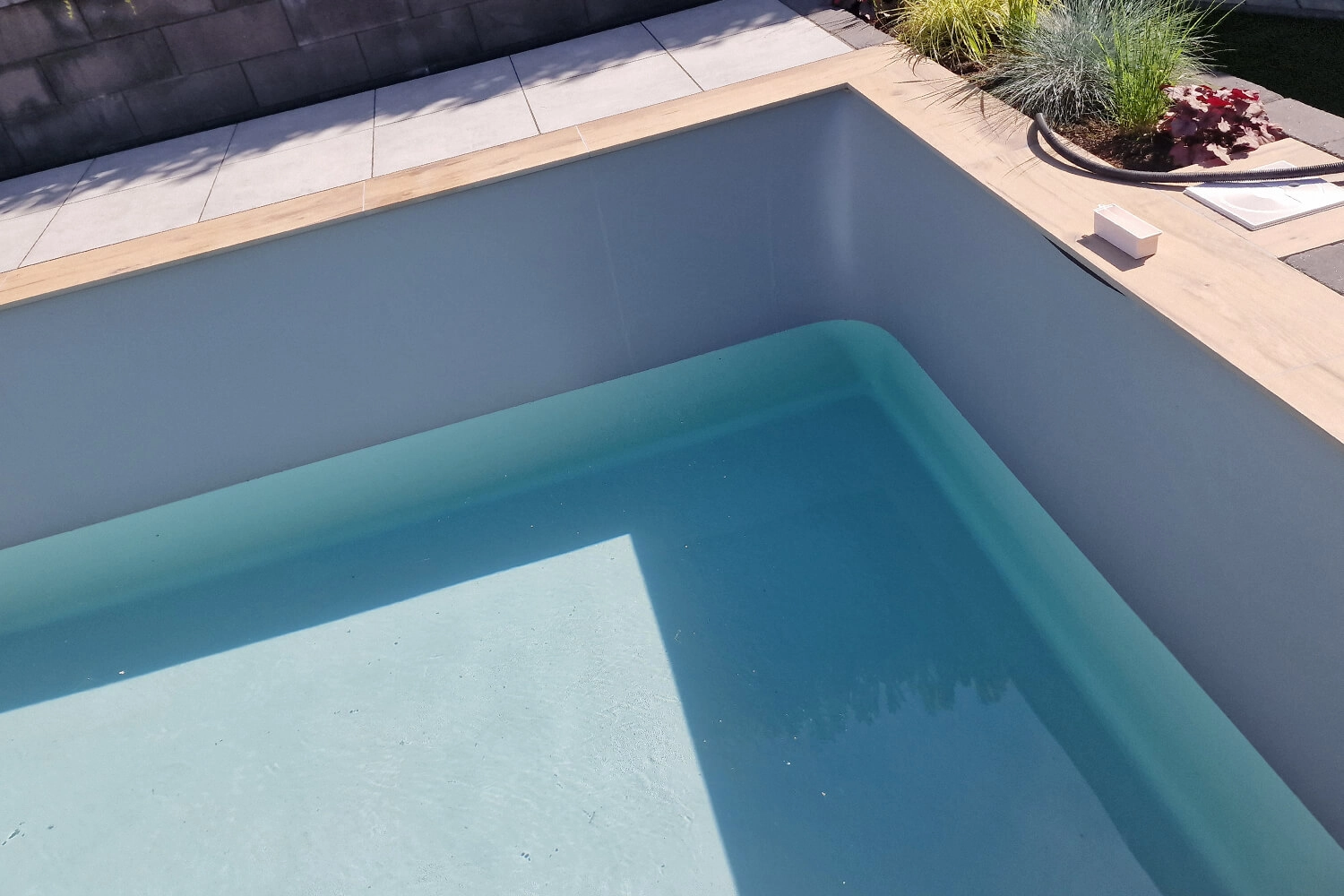 Nous avons eu beaucoup de difficultés avec le liner. Le jour de la pose, il faisait très chaud, ce qui a rendu les angles très arrondis lors du remplissage d’eau. Quelques jours plus tard, par temps plus frais, tout s’est bien passé. De plus, nous avons dû creuser à la main, car il était impossible d’accéder au terrain avec une pelleteuse.