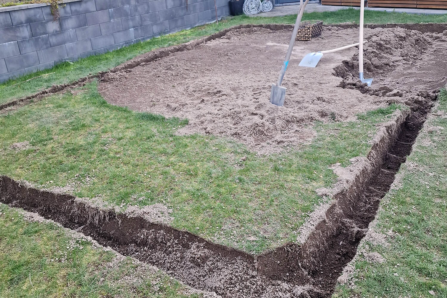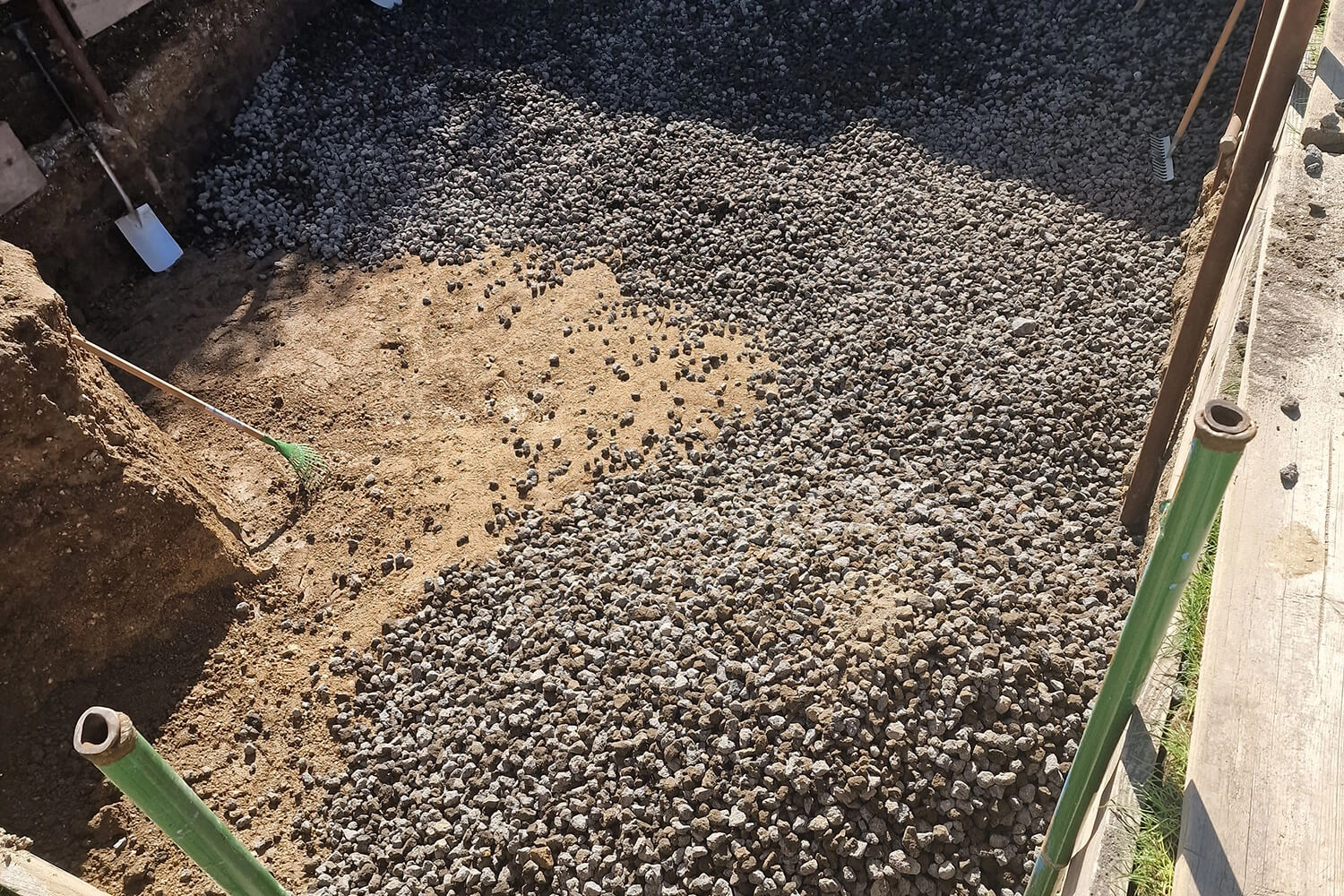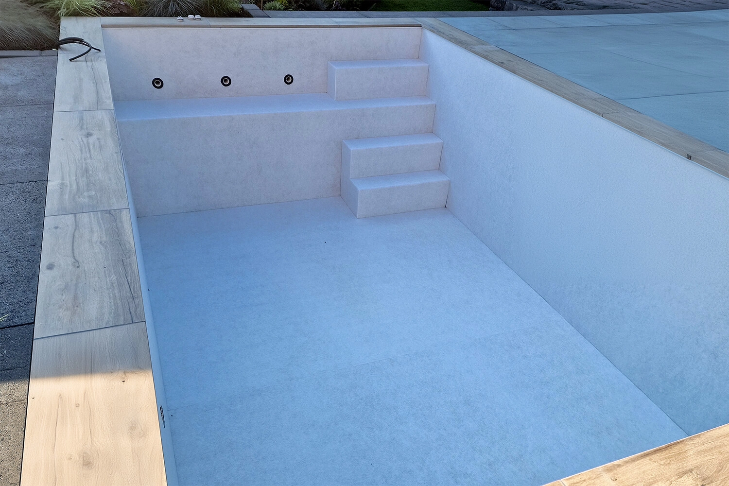 Nous avons eu beaucoup de difficultés avec le liner. Le jour de la pose, il faisait très chaud, ce qui a rendu les angles très arrondis lors du remplissage d’eau. Quelques jours plus tard, par temps plus frais, tout s’est bien passé. De plus, nous avons dû creuser à la main, car il était impossible d’accéder au terrain avec une pelleteuse.