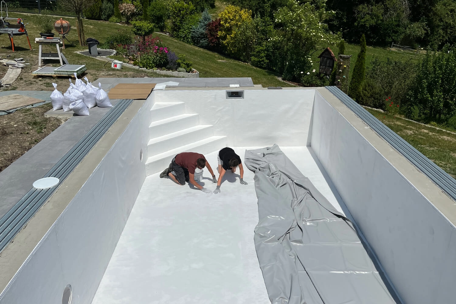 Comme pour beaucoup d’autres, le liner de piscine ! Par une journée de printemps chaude, cela n’a posé aucun problème et a été terminé en une heure.
