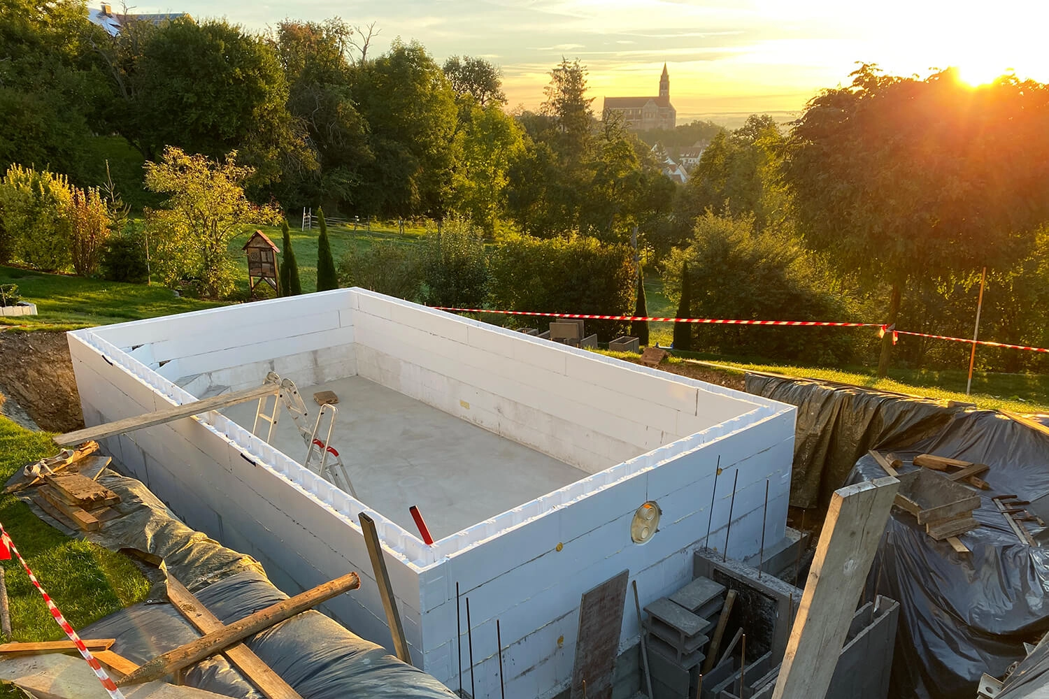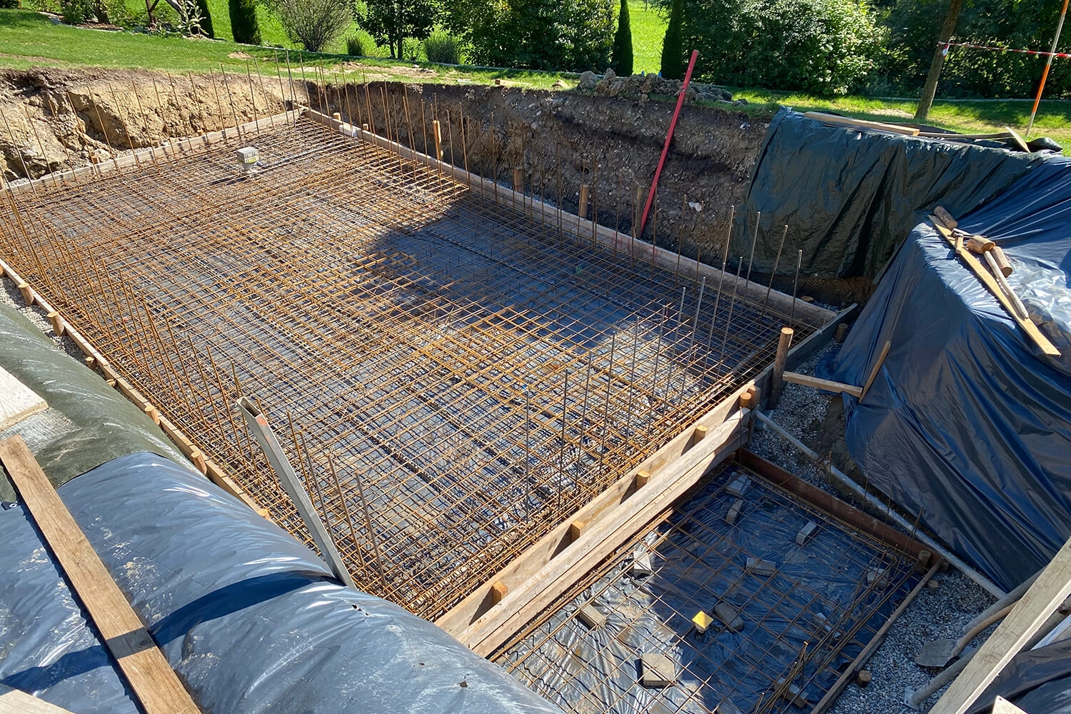 Excavation, armature, béton, gravier, terrasse en bois, mur pour la couverture, clôture, isolation du local technique