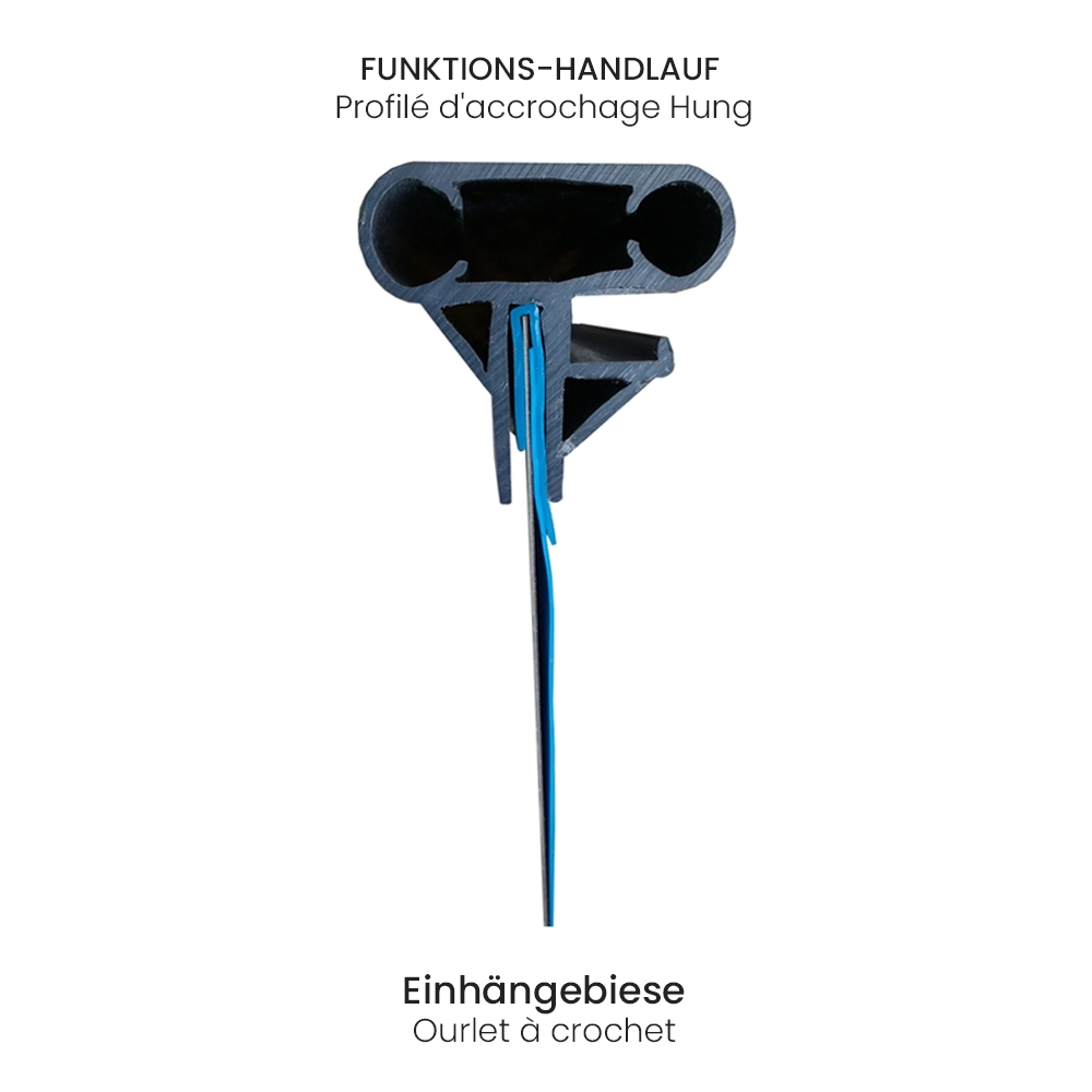 - Accrochage Hung (profilé P3) : Le liner s'insère dans le profilé d'accrochage, ce qui est idéal pour les piscines entérées avec rebords. Le remplacement est possible sans démonter le profilé. Pour changer le liner, il suffit de couper l’ancien liner P1 et d’insérer le nouveau liner P3 avec la fixation Hung.