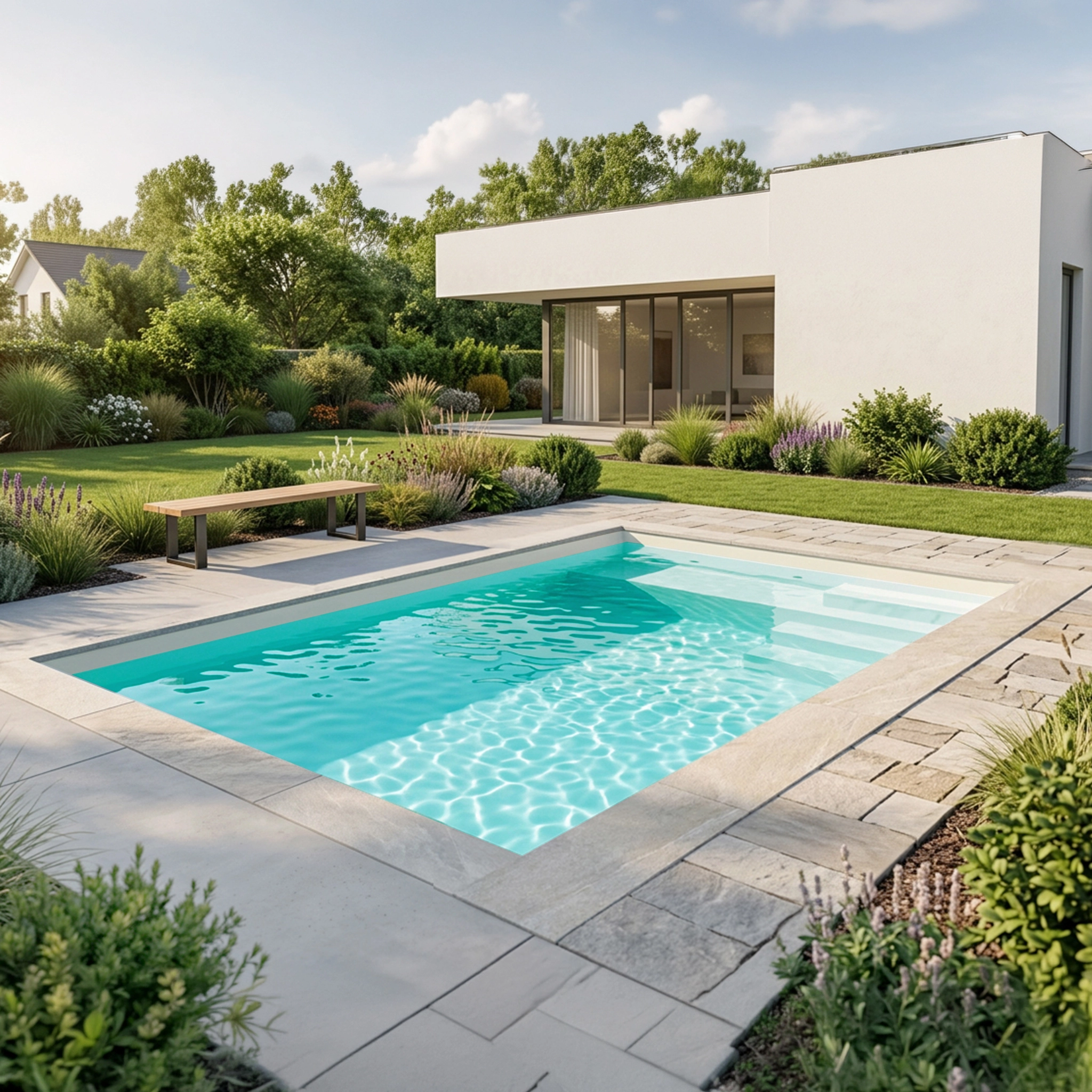 La piscine avec escalier (d'angle ou droit) est un modèle particulièrement populaire comparé aux modèles avec échelle plus traditionnels.