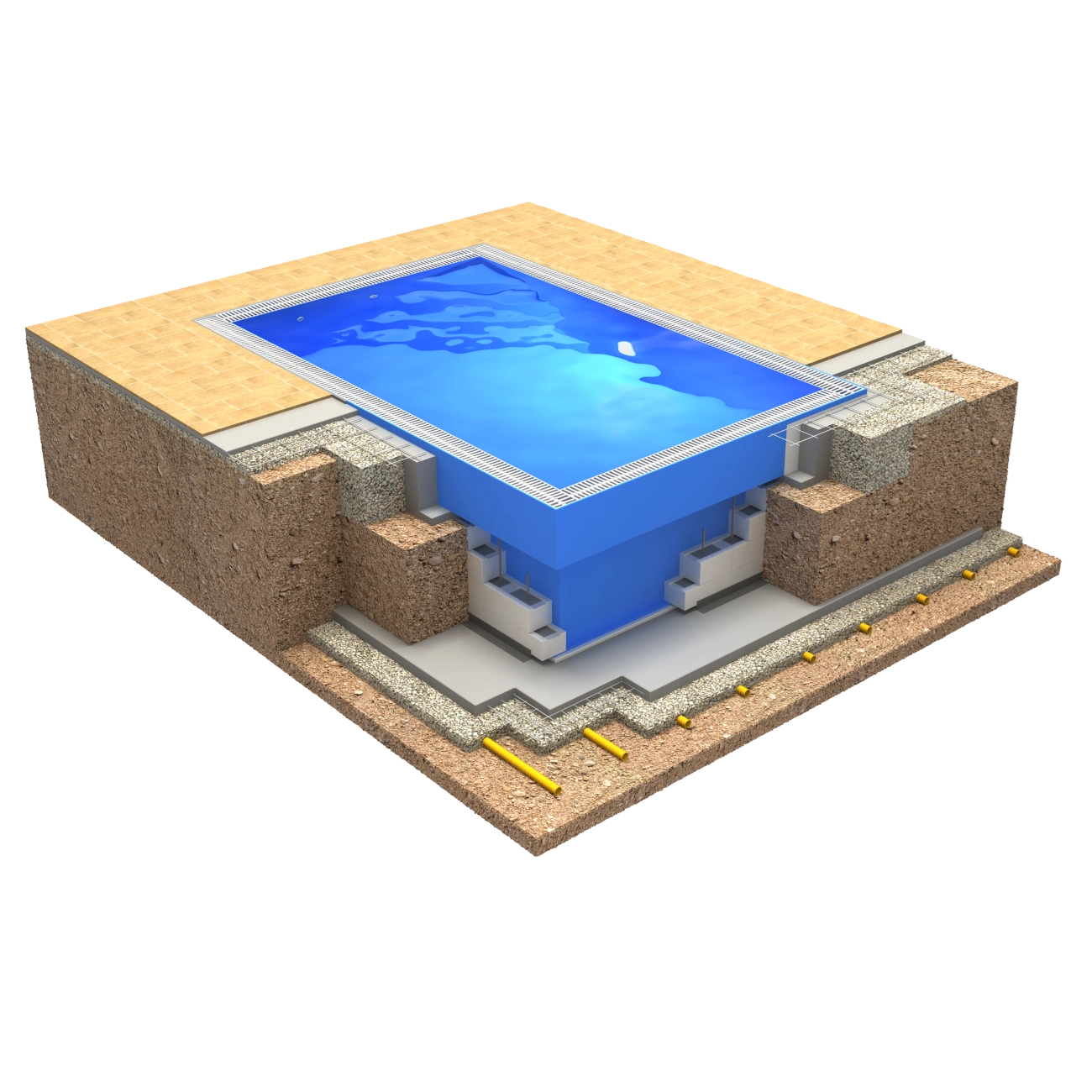 - Corps de la piscine, y compris la tuyauterie en diamètre 50mm, PN10 (protégé en construction thermique) .