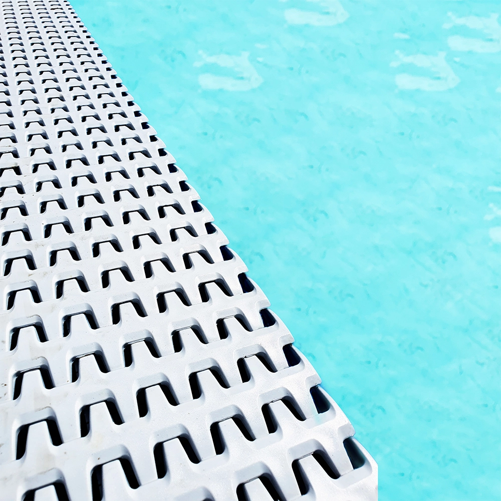 La grille de débordement X-FLOW est disponible en gris et en blanc et est proposée comme variante dans les piscines à débordement. Sa forme limite le débordement de l'eau en dehors de la goulotte et réduit ainsi la consommation d'eau. La piscine se fond élégamment dans le terrain environnant sans différence de niveau.