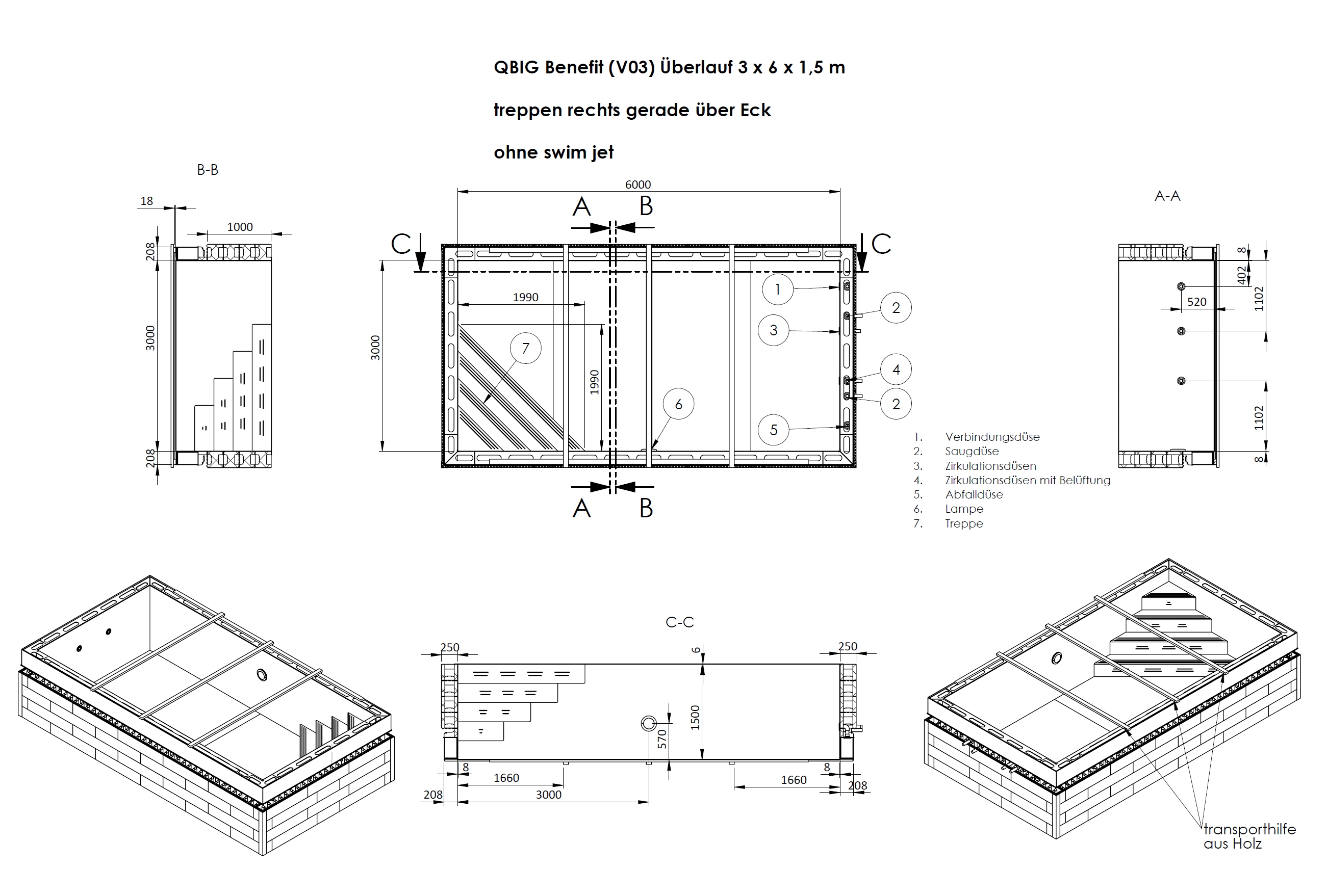 Spécificité de cette gamme : la piscine à débordement QBIG NE nécessite PAS de réservoir de compensation. La goulotte de débordement est conçue de manière à ne pas nécessiter de structure supplémentaire (plus profonde et plus volumineuse). Beaucoup de nos clients choisissent QBIG Benefit d'Albixon précisément pour cette raison!