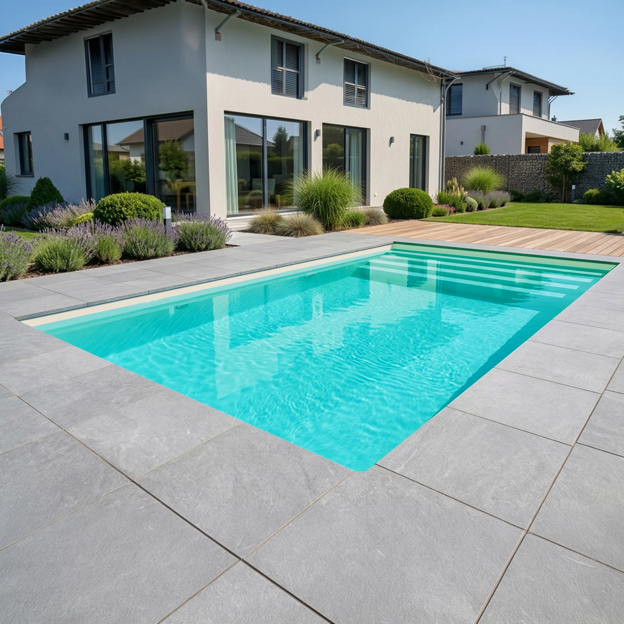 Pour ceux qui recherchent le luxe parfait : nos piscines avec escalier intégré offrent, grâce à leur niveau d’eau élevé, un look piscine époustouflant, créant ainsi une ambiance moderne et spectaculaire.